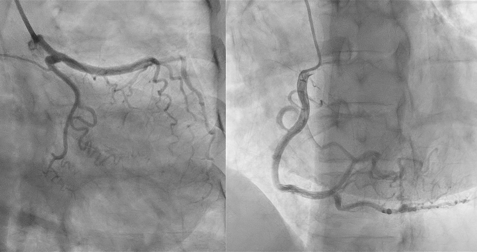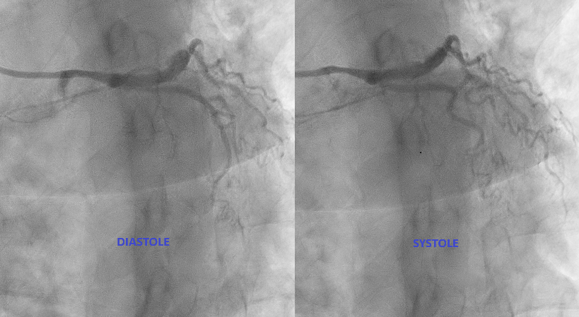 Coronary angiogram via Right radial accessLeft mainstem coronary artery (LMCA) : Moderate Disease 60% TIMI 3