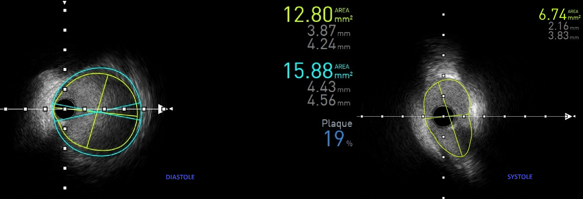 Dynamic compression of LMCA externally (MLA reduction by 47.3%, from 12.8 to 6.74 mm2)Minimal intimal plaqueLAD, LCX, RCA was normal.