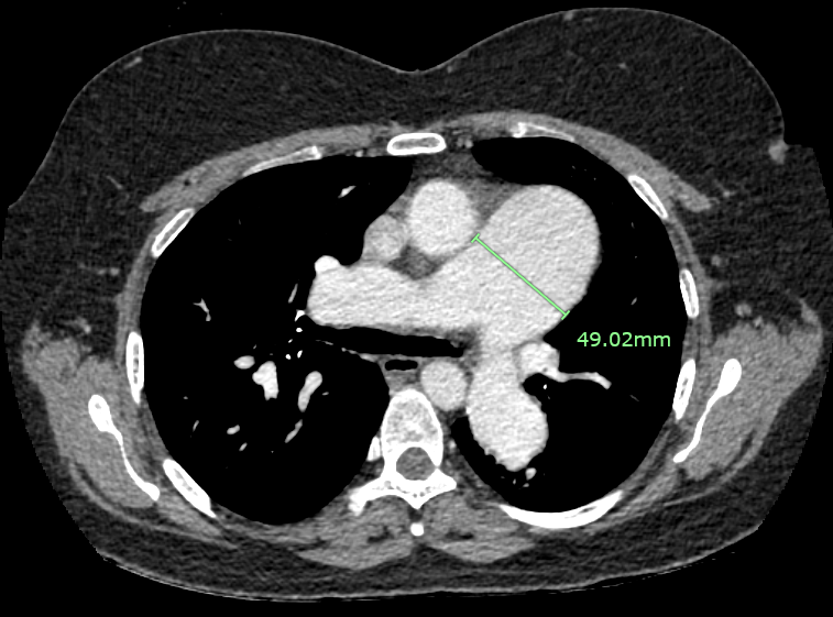 CT scan (CTPA and CT coronary) : Resolved pulmonary artery thrombosis, Normal epicardial coronary arteries. ASD measures 3.2 x 2.9 cm