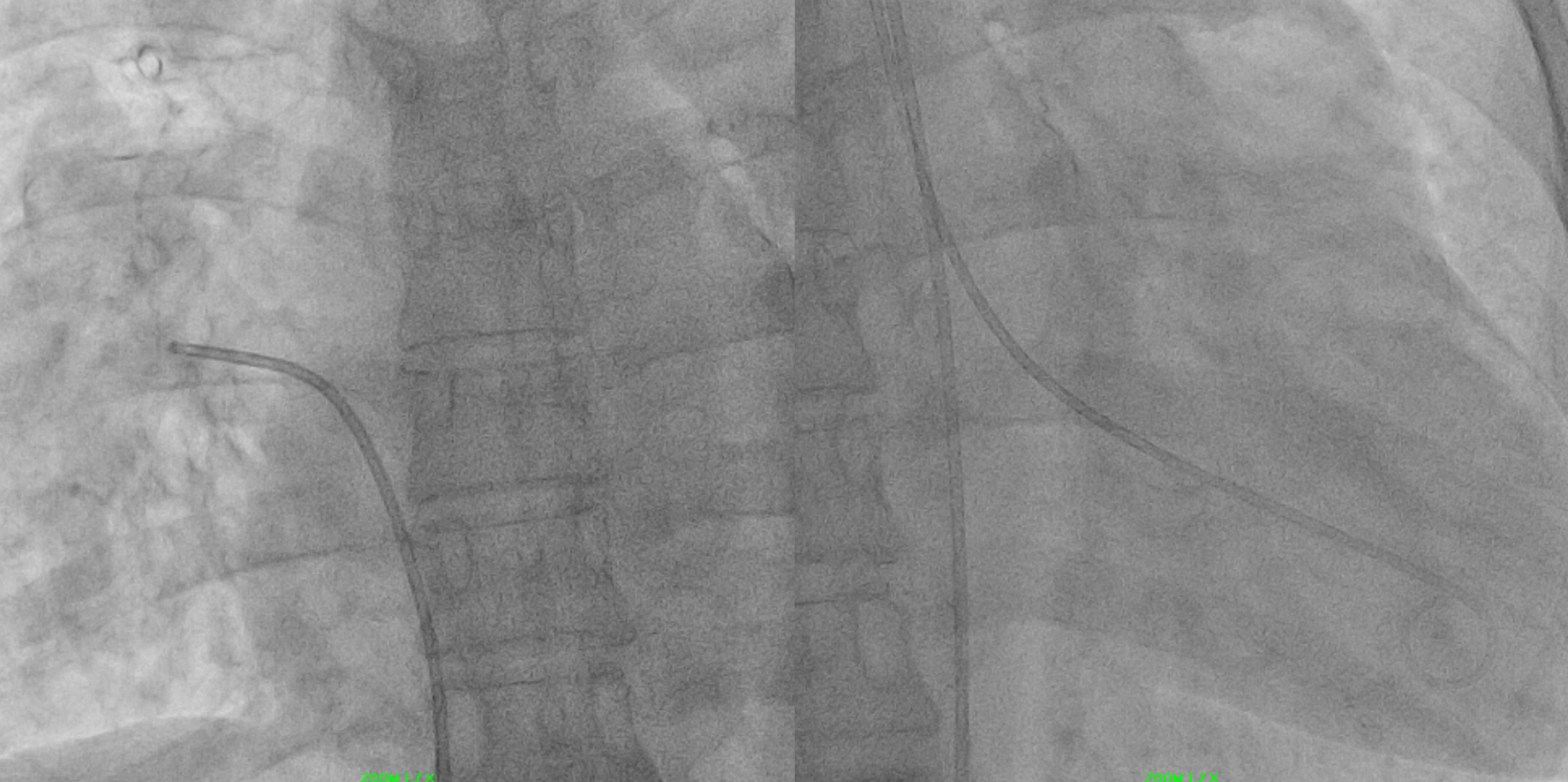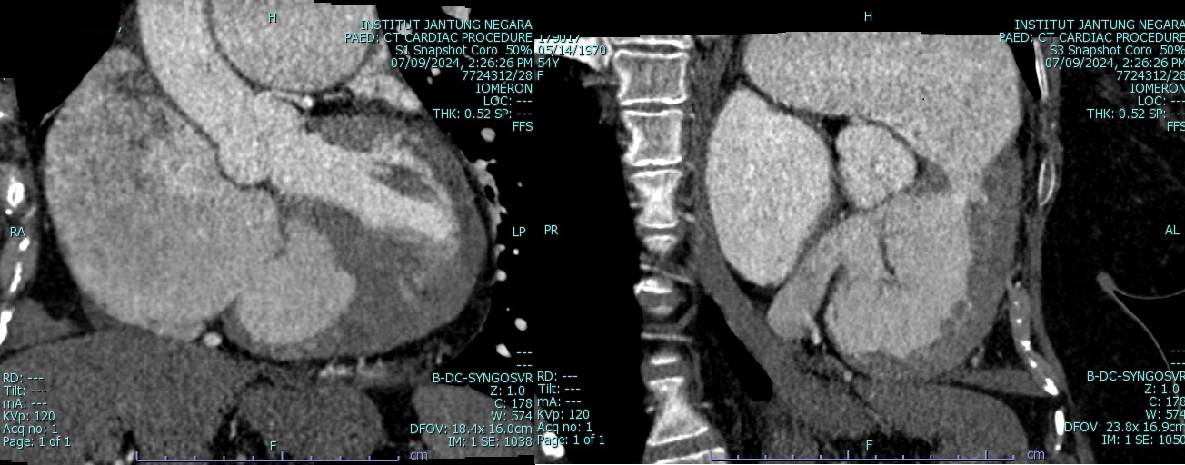 A 55-year-old female with a history of bronchial asthma, dyslipidemia, and an atrial septal defect (ASD) diagnosed in 2005, managed by the Adult Congenital Heart Disease team. She underwent right heart catheterization twice, with the latest Qp:Qs ratio of 0.98 (2015). She has a history of pulmonary artery thrombosis, treated with oral anticoagulants. A recent CTPA showed resolved thrombus and left mainstem stenosis, leading to a planned coronary angiogram.