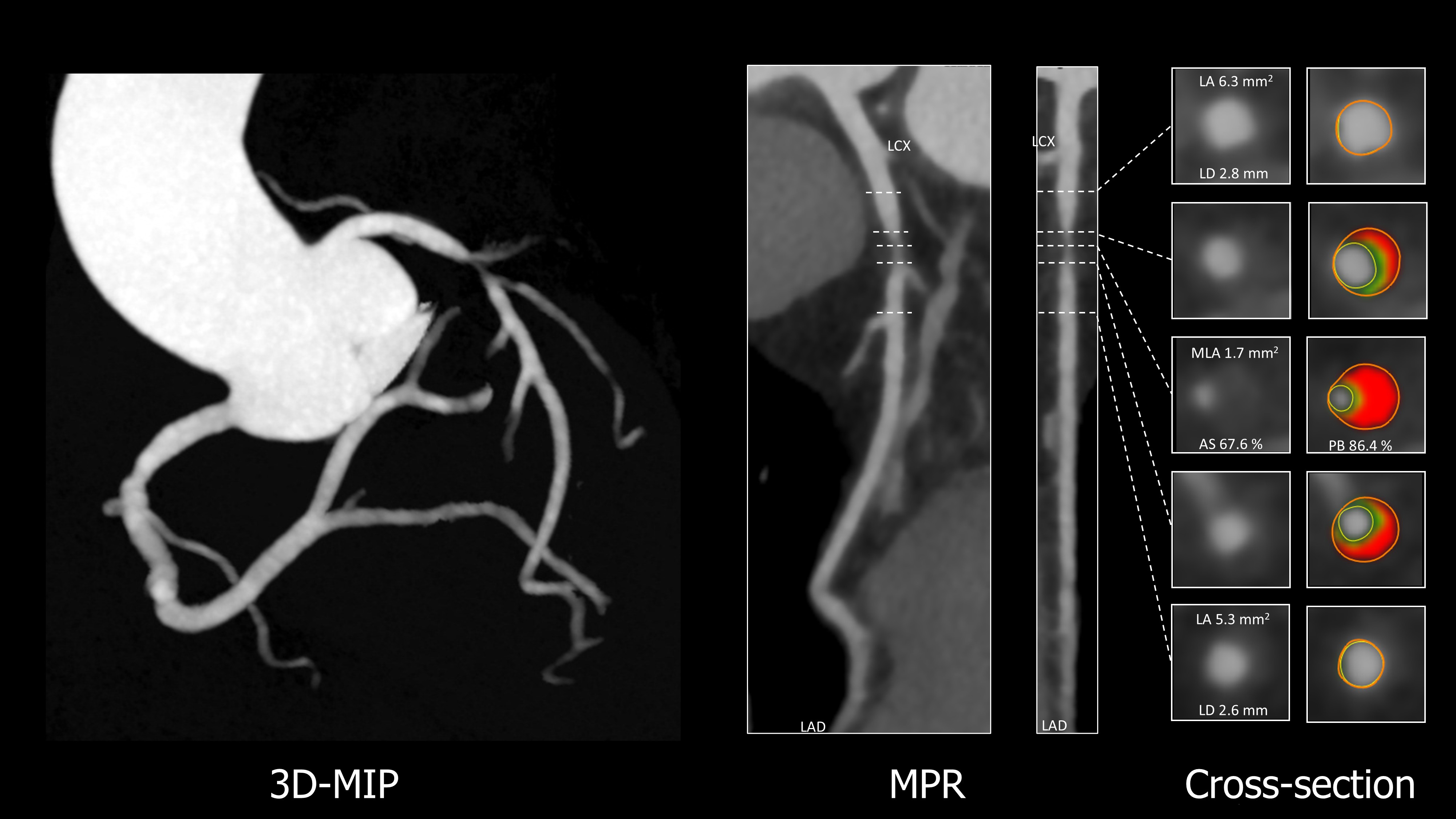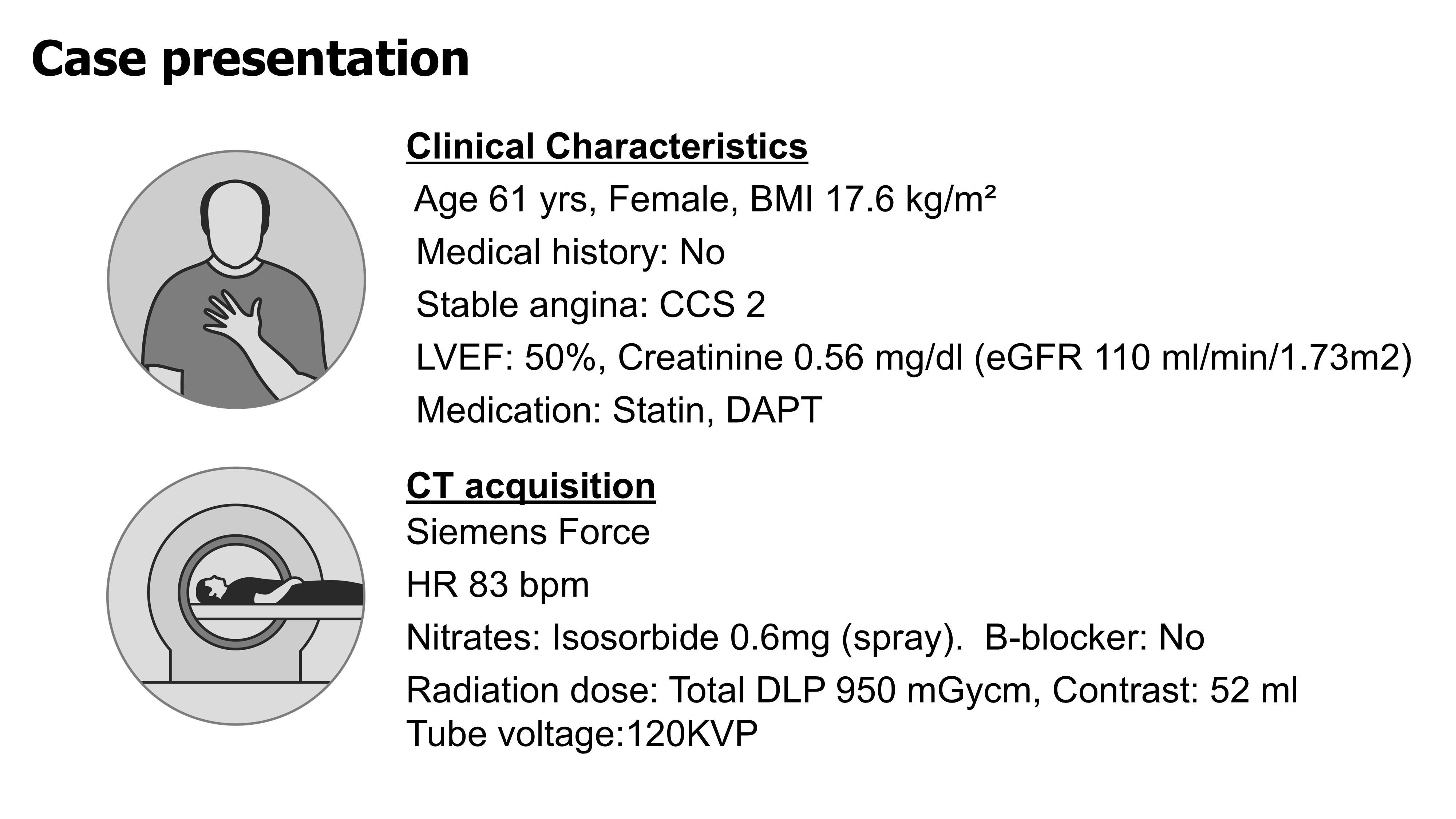 A 58-year-old woman with hyperlipidemia and stable angina was enrolled in the P4 study, a global randomized trial comparing CT-guided and IVUS-guided PCI. She had no diabetes or renal dysfunction. Physical examination and echocardiography were unremarkable. Baseline medications included aspirin and statin.