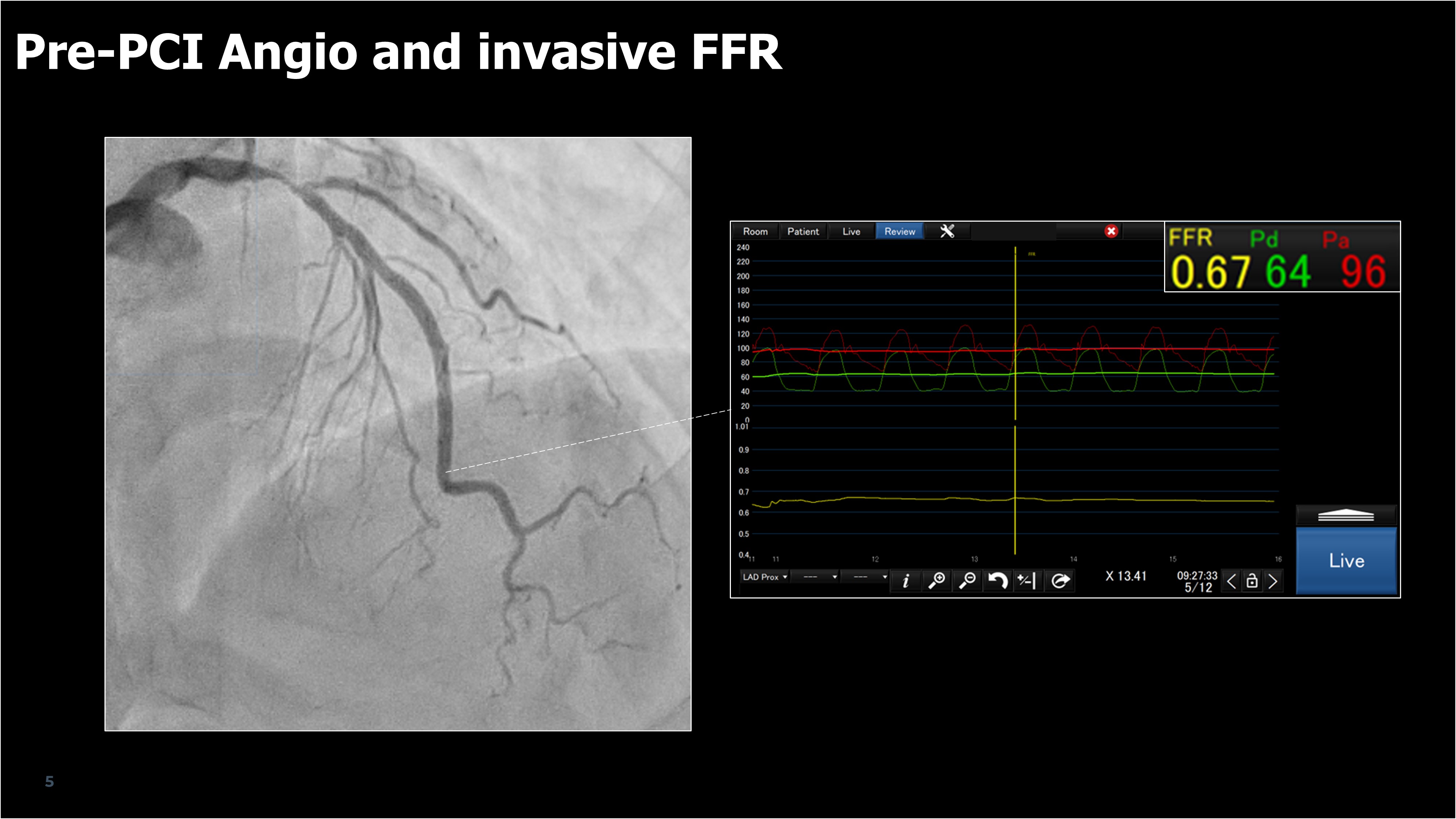 Coronary angiography confirmed severe proximal LAD stenosis consistent with the CCTA findings. Invasive FFR before PCI was 0.67.