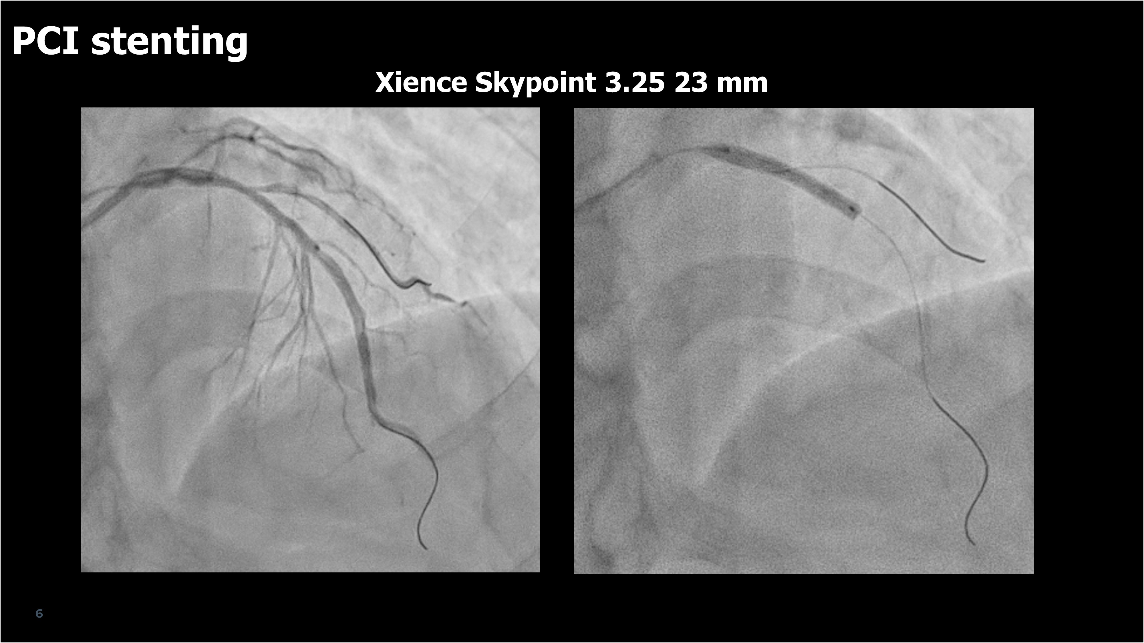 Following the CT-guided plan, PCI was performed without intravascular imaging, in accordance with the P4 study protocol.A 3.0 ¡¿ 23 mm drug-eluting stent (Xience Skypoint, Abbott Vascular, USA) was deployed in the proximal LAD, with wire protection for the diagonal branch supplying 14% of myocardial mass. Post-dilatation achieved optimal expansion confirmed by stent enhancement. The final angiogram showed excellent result with preserved side branch flow.Invasive FFR improved from 0.67 to 0.94, closely matching the predicted FFRCT value (0.92). The procedure was uneventful, and no complications occurred during 30-day follow-up.