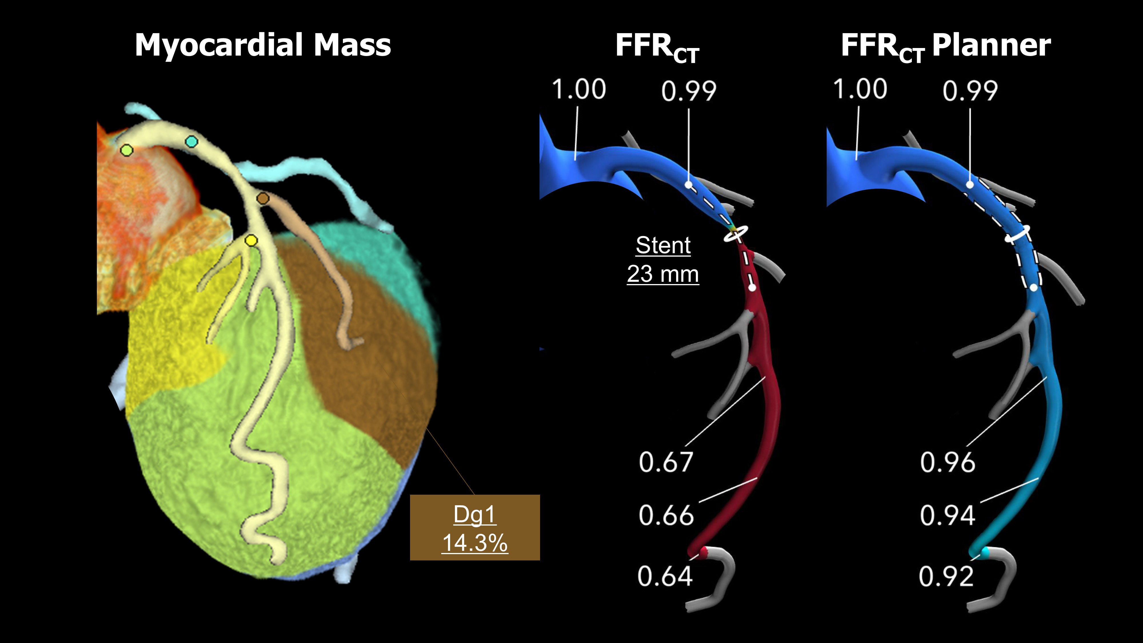 Coronary CT angiography (CCTA) demonstrated significant stenosis in the proximal left anterior descending artery (LAD). CT-derived fractional flow reserve (FFRCT) showed ischemia (0.68). CT analysis guided stent sizing with 23mm. The lesion was predominantly lipid-rich without calcification, requiring no modification. Virtual PCI using the FFRCT Planner predicted post-PCI FFRCT of 0.92.