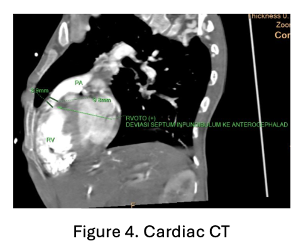 Patient discharge four days later, increased peripheral oxygen saturation from 84% to 92% room air. Follow up at three months shown significant improvement of the symptom. Transthoracic echocardiography evaluation pre-discharge shown patent flow of the stent, and three month CT follow up shown patent flow of the stent and increased of pulmonary artery size. In conclusion, late-presenting ToF patients face complex risks; RVOT stenting provides effective palliation, improves oxygenation, and bridges to surgery or definitive management.