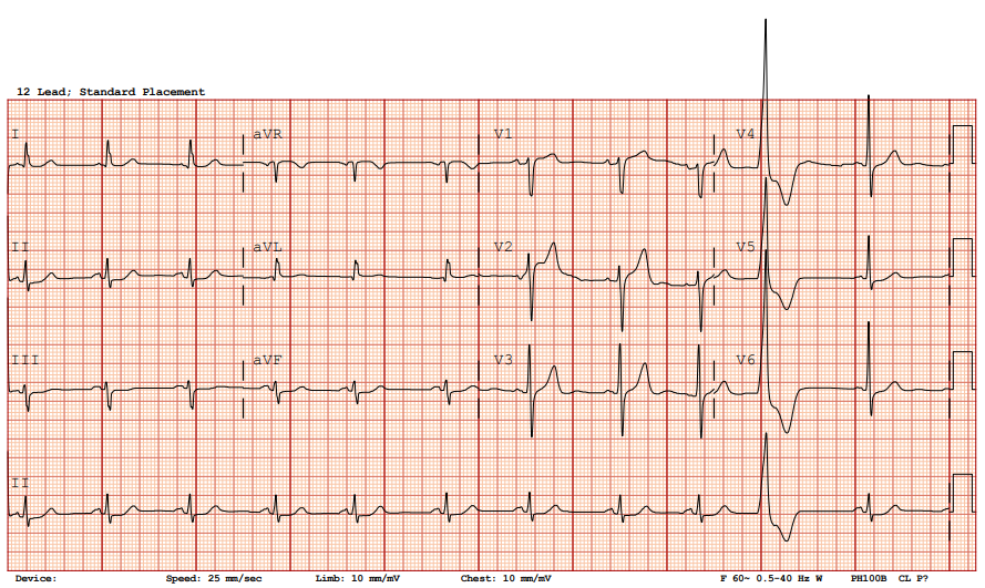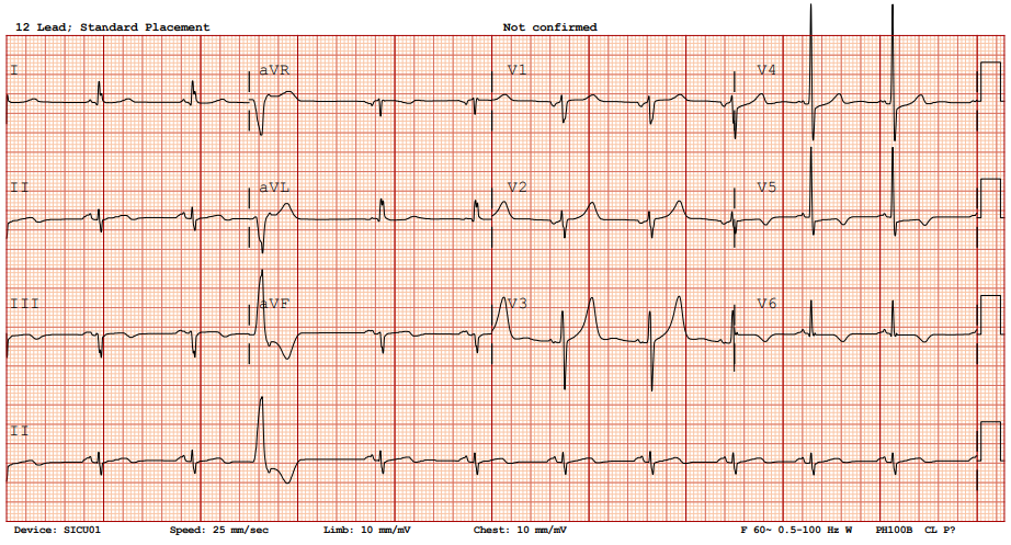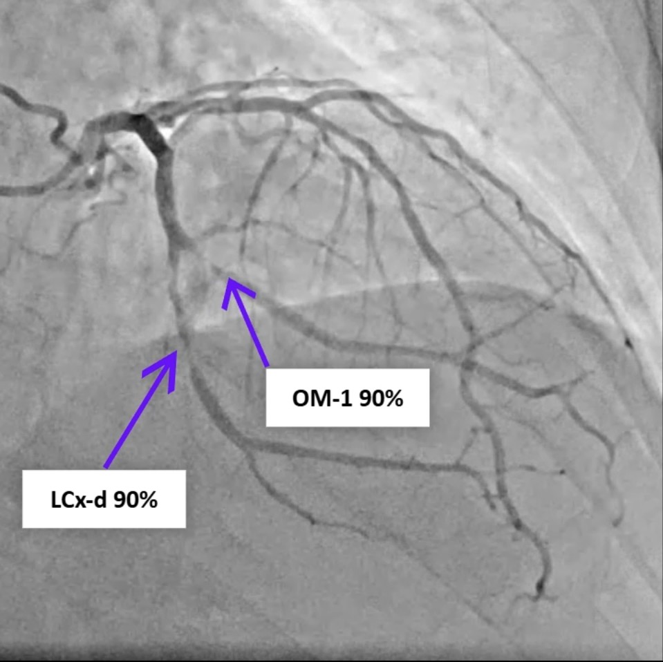 A 77-year-old man with hypertension, diabetes, and prior coronary artery disease presented with progressively typical angina for several days and was diagnosed with non-ST-elevation myocardial infarction. He underwent successful percutaneous coronary intervention with drug-eluting stents to the distal left circumflex and obtuse marginal (OM-1) branch, achieving TIMI-3 flow. Eight hours later, he developed sudden dizziness, diaphoresis, hypotension, and jugular venous distention.
