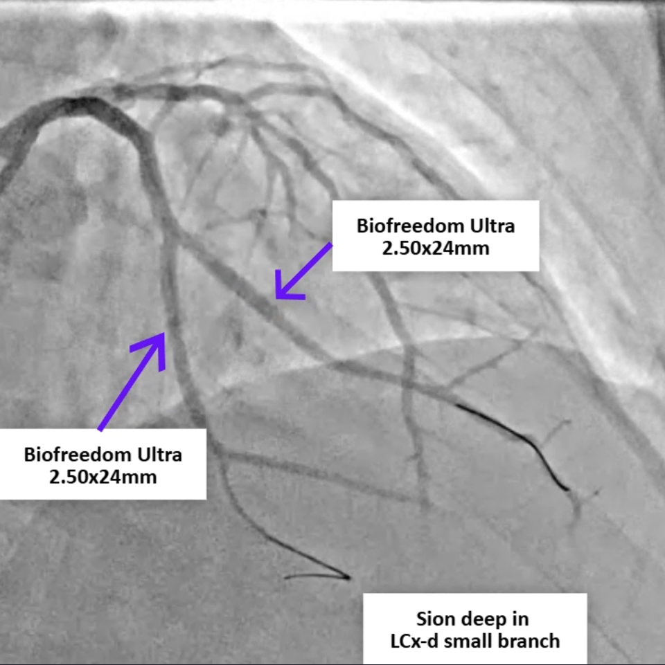 Review of the primary PCI angiography revealed no contrast extravasation; however, the Sion wire had advanced deeply into a small distal branch of the LCx artery, in hindsight possibly causing a distal micro-perforation. Repeat angiography demonstrated patent stents in both the left circumflex and obtuse marginal branches without in-stent thrombosis. No persistent or visible extravasation was noted, suggesting spontaneous hemostasis of the suspected micro-perforation.