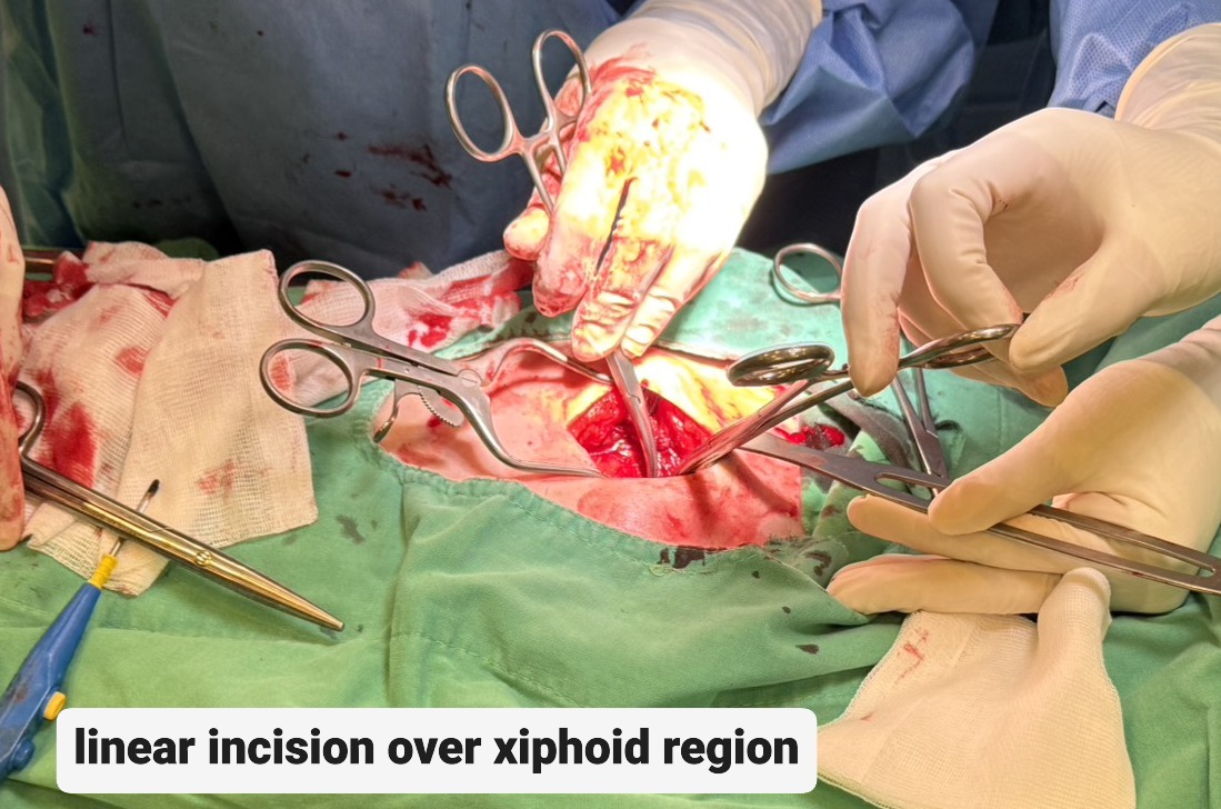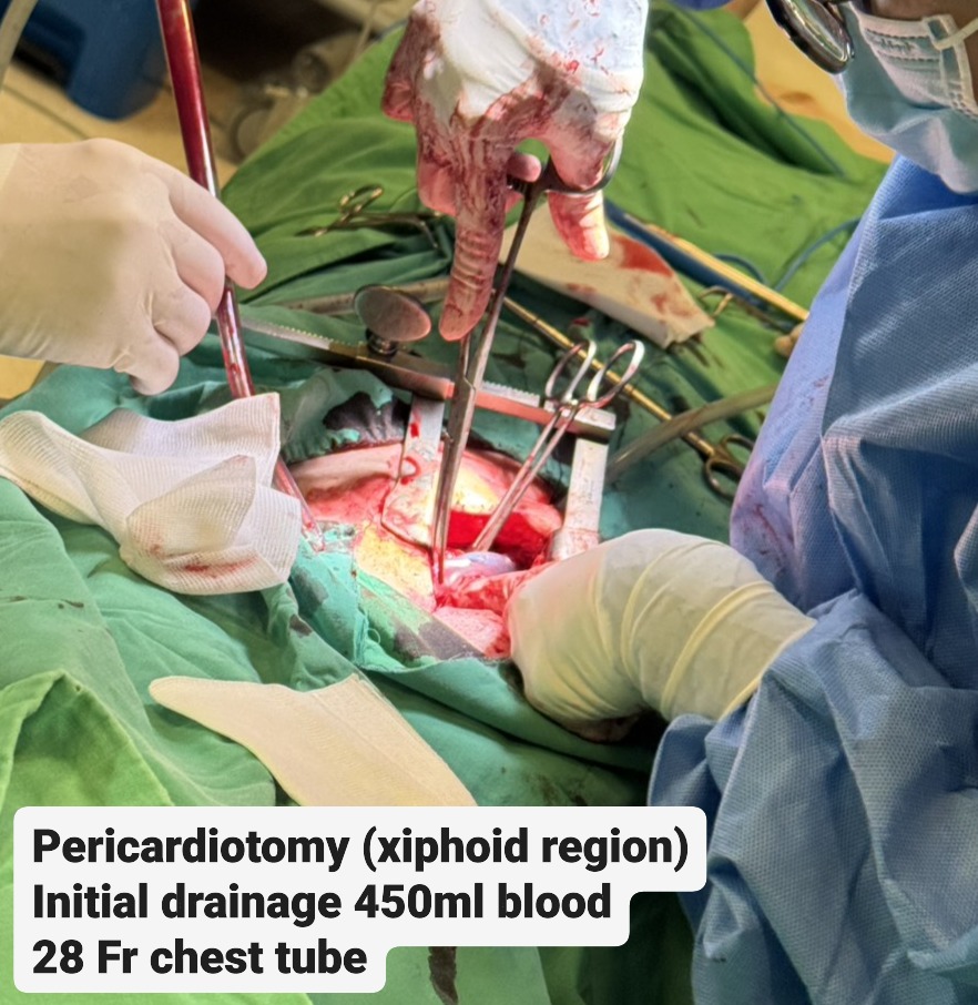 Due to cardiac tamponade with progressing shock, the patient was immediately evaluated for emergency intervention. A cardiovascular surgeon performed an emergent subxiphoid pericardiotomy under local anesthesia. After sterile preparation, a linear incision was made over the xiphoid region and deepened to the pericardium, which was opened bluntly. Approximately 450 mL of fresh blood was evacuated, and a 28 Fr chest tube was inserted for continuous drainage. The patient¡¯s blood pressure rose dramatically from 70 mmHg systolic to over 200 mmHg after decompression, indicating effective relief of tamponade. Once hemodynamic stability was achieved, the interventional cardiology team performed repeat coronary angiography to identify the potential source of bleeding, as detailed in the previous section. The patient was then transferred to the intensive care unit for close monitoring. Chest tube drainage was minimal (0 mL) on postoperative day 2, and follow-up bedside echocardiography revealed no residual pericardial effusion or right ventricular diastolic collapse. The chest tube was subsequently removed, and the patient was transferred back to the general ward for discharge preparation.