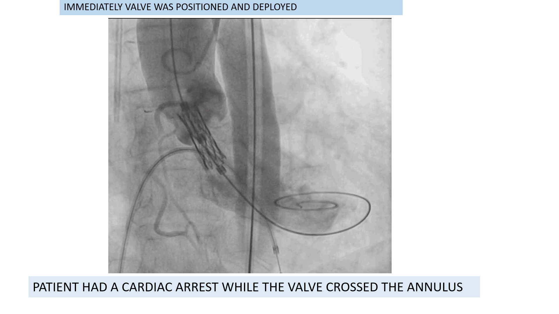 ValveCrossing and Pre-Dilatation: The native valve was crossed using an ST wire overan AL1 support catheter. Prediction: Balloon Dilatation was performed using an18x40 mm balloon. CatastrophicComplication: The patient suffered a Cardiac Arrest as the new valve crossedthe annulus. EmergencyManagement: The operator immediately prioritised valve deployment, which wassuccessfully positioned and implanted. CauseIdentified: Post-deployment Echocardiography (ECHO) revealed a PericardialEffusion Resuscitation:CPR and repeated Cardioversion for recurrent Ventricular Fibrillation (VF) wererequired and continued for 10 minutes until spontaneous rhythm was restored. SurgicalIntervention: The patient was urgently taken to the Operating Theatre (OT) forExploration. SurgicalFinding: Right Atrial (RA) Appendage Perforation was identified as the sourceof bleeding. This is a known, though rare, complication often associated with the manipulation of the stiff guide wire or temporary pacing wire. TAVI ValveIntegrity: No Annular Leak was observed, confirming the new Myval THV waswell-seated and functional. Recovery: Thepatient was maintained on a ventilator overnight, successfully extubated thenext morning, and discharged after 5 days, indicating a full recovery from theacute complication.