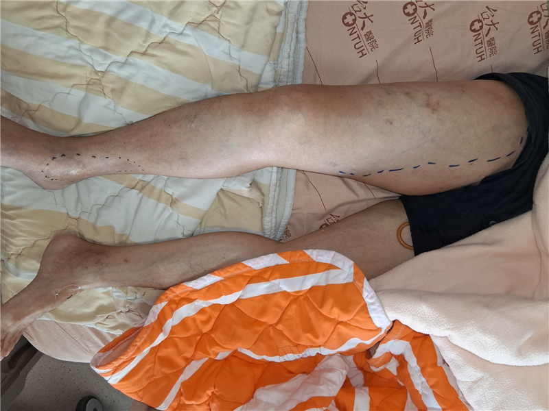 A 69-year-old man with recurrent retroperitoneal well-differentiated liposarcoma presented with fever, dysuria, and progressive right leg swelling and pain. Examination showed right leg warmth, grade II pitting edema, and tender telangiectasia over the right groin, suggesting DVT.