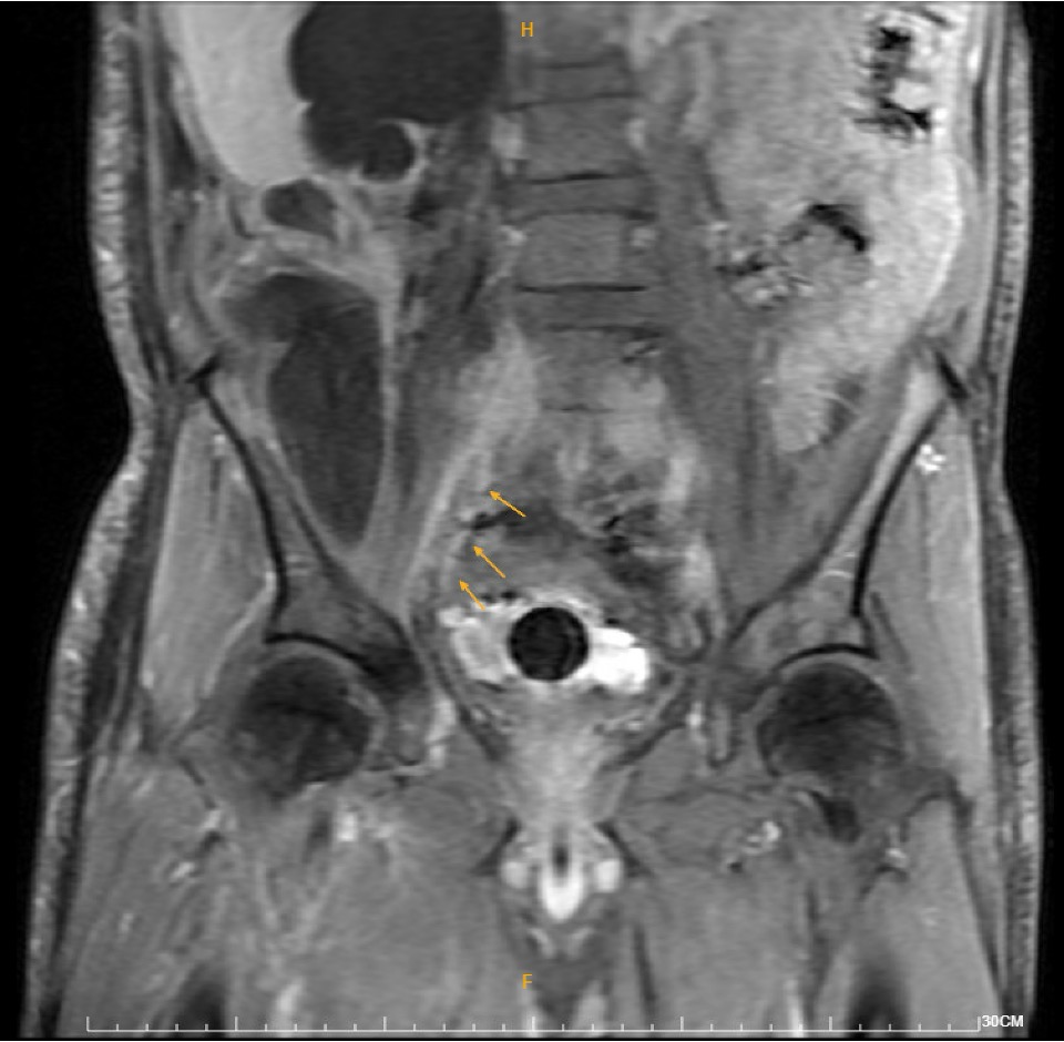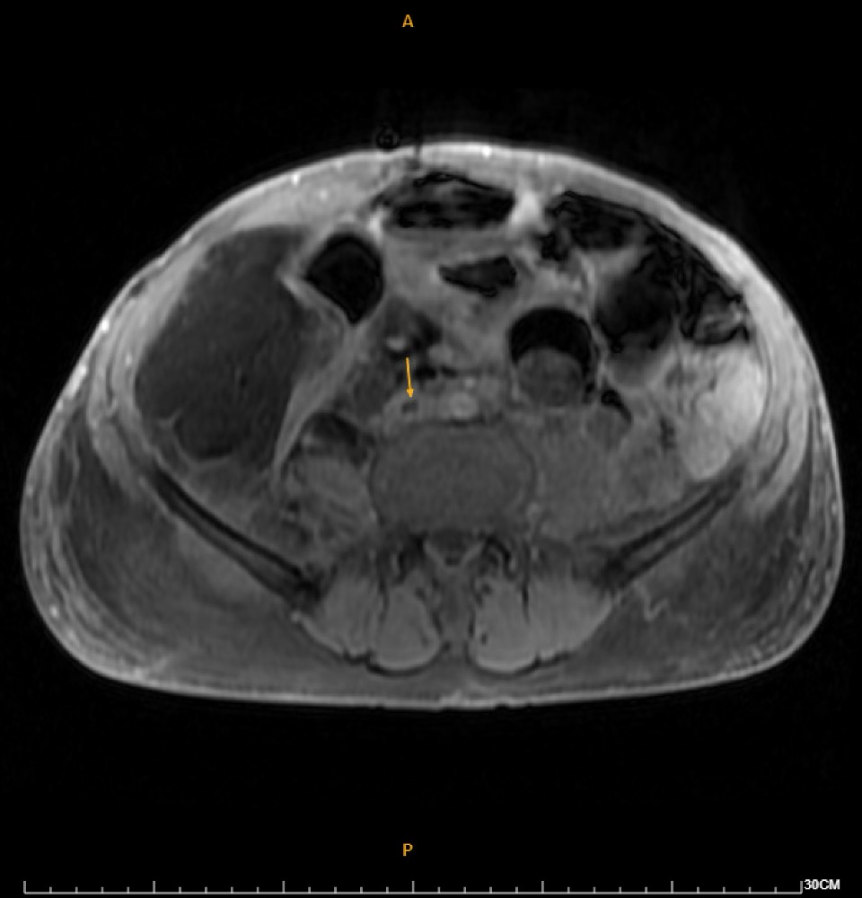 Duplex ultrasound demonstrated thrombosis from the right common femoral vein to the calf veins. MRI revealed a 16.8-cm retroperitoneal fat-containing tumor causing severe right hydronephrosis, and extensive thrombosis involving the right common, external, and internal iliac arteries, lower IVC, iliac, and femoral veins. DVT intervention was arranged.