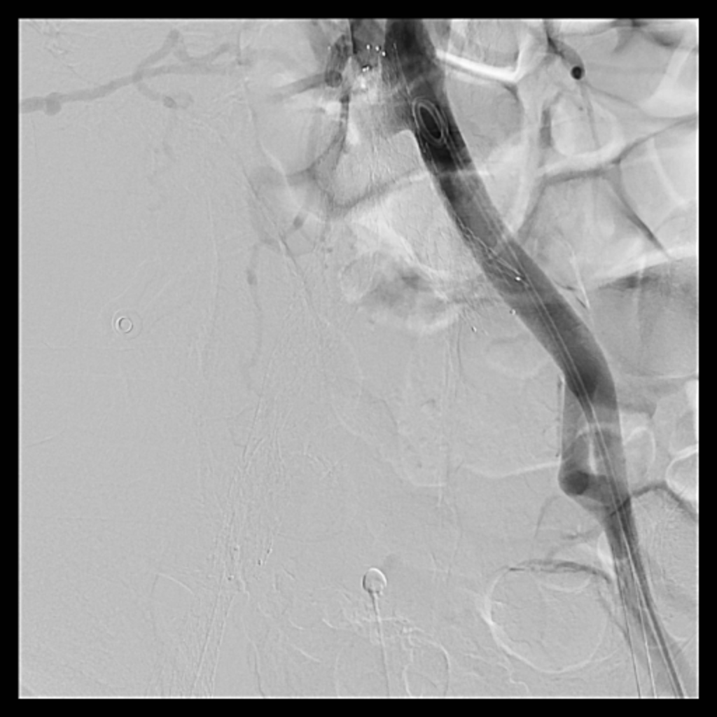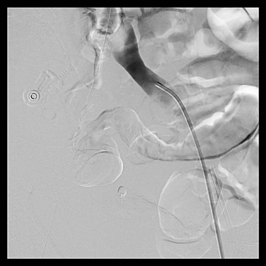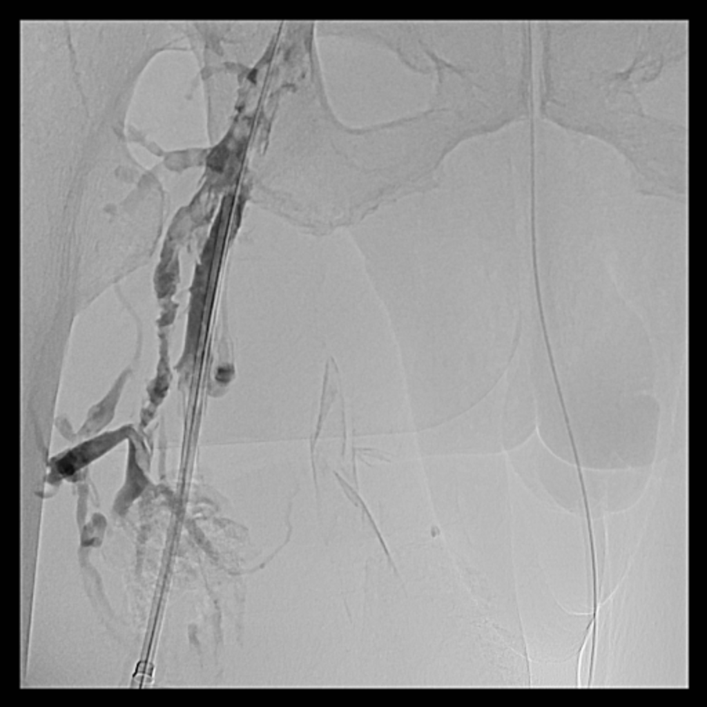 Catheterization revealed total occlusion of the right common iliac artery, likely due to tumor compression. Diffuse thrombosis was seen in the right common femoral vein, with total occlusion from the right common iliac vein to proximal RCFV. LCIV ostial stenosis (~80%) and IVC stenosis (~90%) were also present.