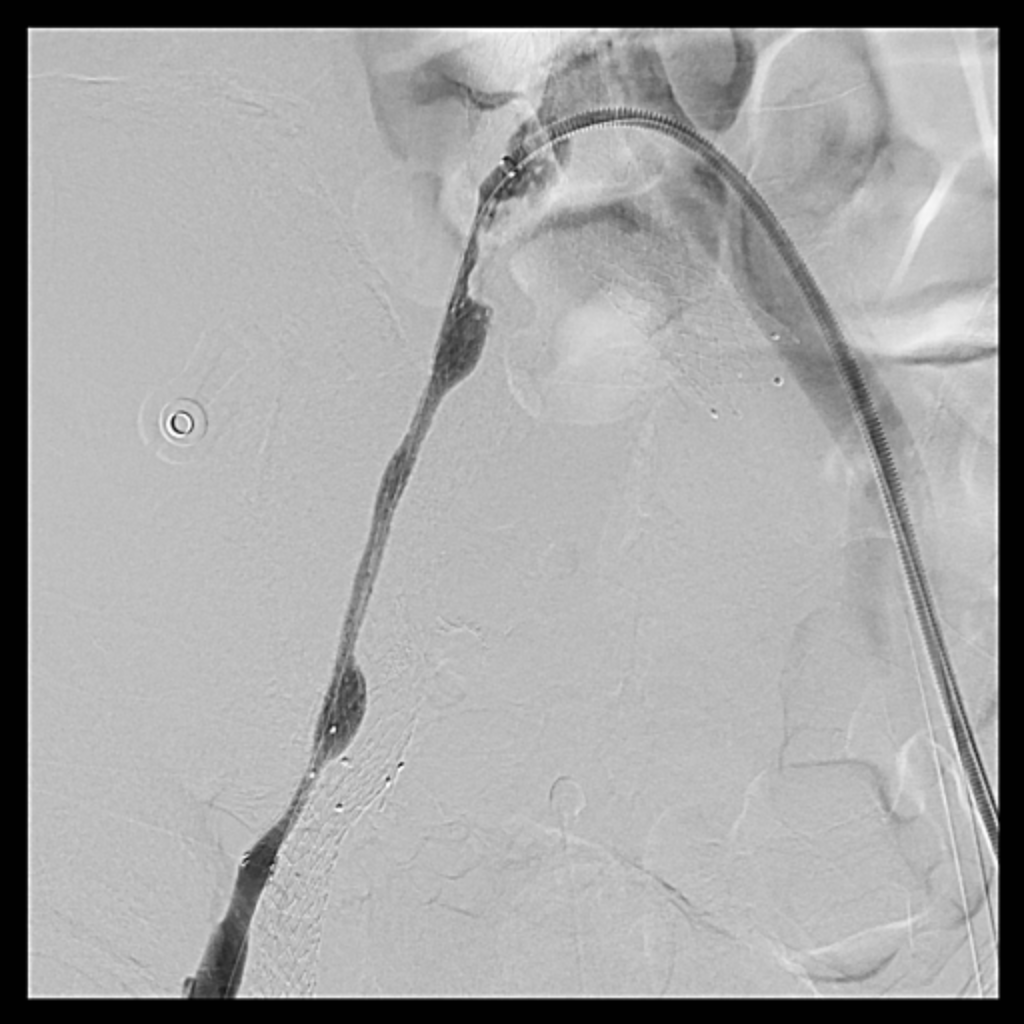 Venous access was obtained and venography confirmed heavy thrombus burden; therefore, the initial 6 Fr sheath was upsized to a 9 Fr sheath. Two Terumo stiff wires were advanced into the IVC to secure stable access. Mechanical thrombectomy using the Boston Scientific AngioJet system was performed from the right iliac vein to the right common femoral vein. During venography, unexpected early arterial opacification suggested an iatrogenic artery-to-vein fistula. Iliac angiography was then performed, revealing a total occlusion of the right common iliac artery with collateral reconstitution. To restore arterial flow and seal the fistula, a contralateral approach was used. A wire successfully crossed the occluded segment into the true lumen, followed by deployment of a covered stent. Final angiography showed complete closure of the fistula and restored antegrade arterial flow without distal embolization. The patient remained hemodynamically stable.