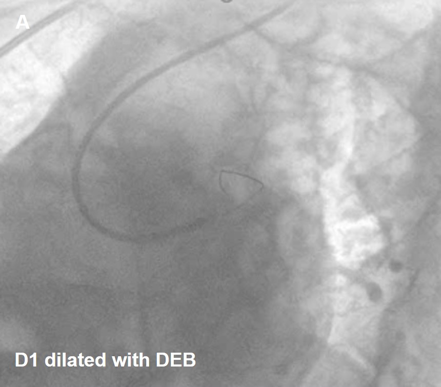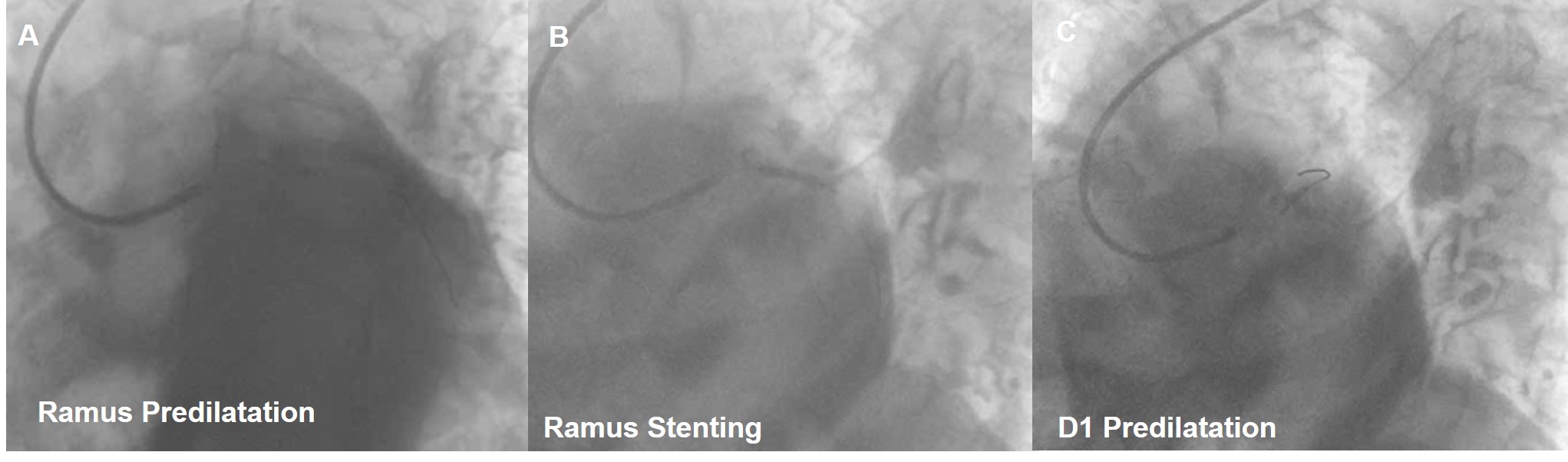 Procedure performedthrough right radial artery LMCA engaged with 6Fr EBU 3.5 Guiding catheter, 0.014X180cmRun-through wire placed in LAD and another Run-through wire was placed in Ramus.Predilatation done with 2.0x12mm Balloon. RAMUS stenting was done with 2.75X18mm Onyx DES. Diagonaldilatation done with 2.0 x 25mm PREVIL Drug Eluting Balloon. Thefinal result was good with TIMI III Flow without any edge dissection andresidual stenosis. Patient was discharged in a stable status on 3rd postprocedure day without any CV Symptoms.