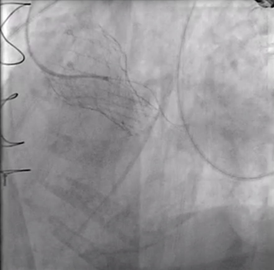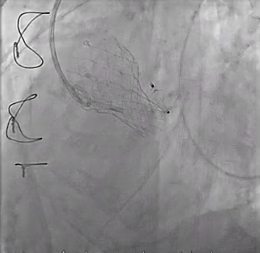 Aortogram: a paravalvular leakage noted between SAVR and TAVR valveHemodynamic study:- Pulmonary wedge pressure = 18 mmHg- Pulmonary artery pressure = 58/19 mmHg (mean 37 mmHg)- RV pressure = 71/5 mmHg- RA mean pressure = 9 mmHg- IVC pressure = 9 mmHg- Cardiac output (thermodilution): 3.73 L/min- PVR = 5 woods (408 Dynes.sec.cm-5)