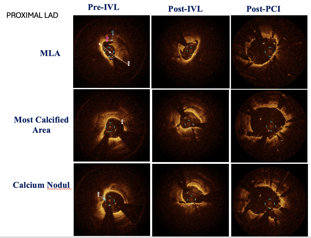 At the 1st encounter, RCA CTO PCI was performed with a plan for staged PCI of the left system. Using a 7F AL 0.75 for strong support, an antegrade approach with a double-lumen microcatheter and parallel wire technique (Pilot 150) successfully crossed the lesion. Predilatation with a 1.5 ¡¿ 15 mm balloon was done. IVUS could not pass due to 360¡Æ calcification. Rotablation with a 1.25 mm burr was attempted but limited to mid-RCA. Two DES were implanted from mid to proximal RCA, followed by post-dilatation.At the 2nd encounter, RCA stents were patent. PCI was done on LM, LAD, and D2. D2 was treated with DCB. LAD predilatation followed by OCT showed severe 330¡Æ calcification (max thickness 1.04 mm, MLA 1.63 mm©÷). IVL with a 2.75 ¡¿ 12 mm balloon (30 pulses) achieved multiple calcium fractures. A 2.75 ¡¿ 33 mm DES was deployed with good OCT results.At the 3rd encounter, 6 months later, the patient presented with ADHF. Angiography revealed RCA ISR CTO at the mid-bending site. The lesion was crossed with a Pilot 200 wire; predilatation showed a dog-bone sign. We do balloon based strategy for plaque modification using cutting, scoring, and double-wire balloons. IVUS showed stent underexpansion with 270¡Æ calcification and distal RCA stenosis. IVL with 2.5 and 2.75 mm balloons optimized the lesion, followed by two DES from distal to mid RCA. Post-PCI IVUS confirmed good result.