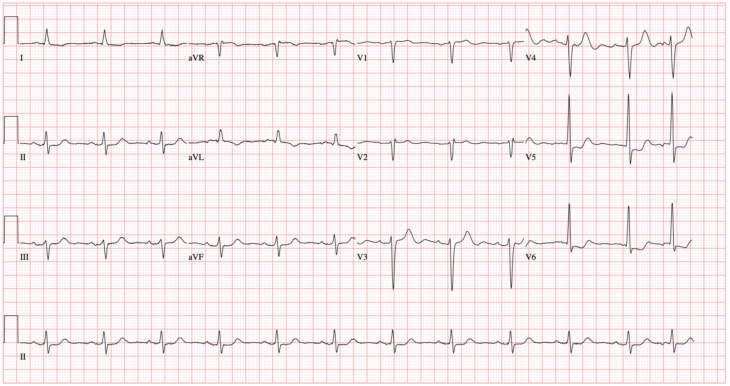 ECG revealed PACs with ST-depressions in leads V5-V6. Troponin I was elevated at 446. Transthoracic echocardiogram revealed concentric remodeling, mild hypokinesia in the anteroseptal wall at the mid and basal levels, and preserved LV ejection fraction at 69.3%.