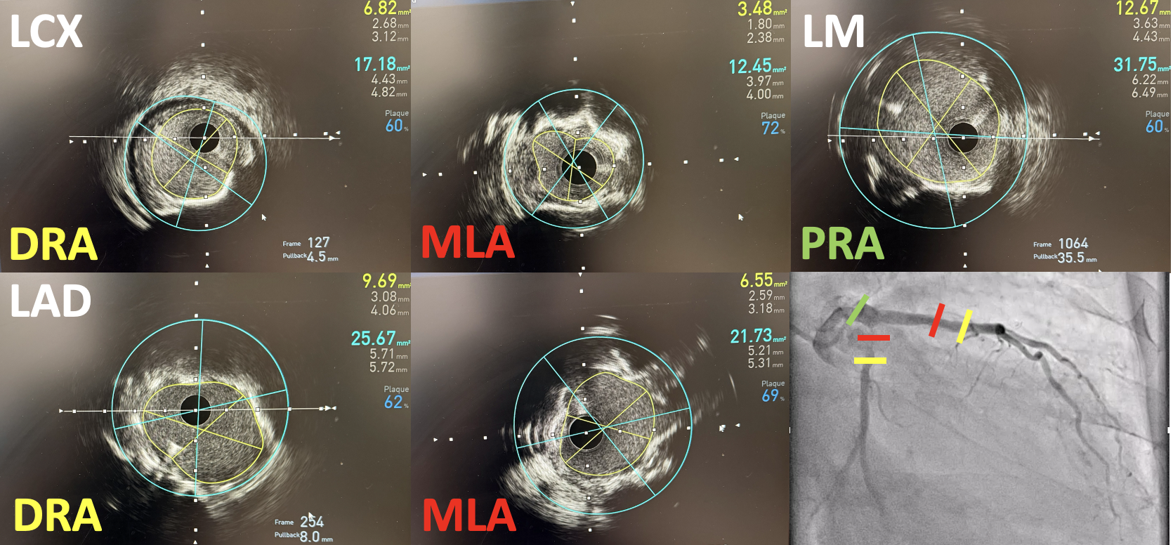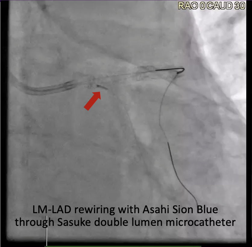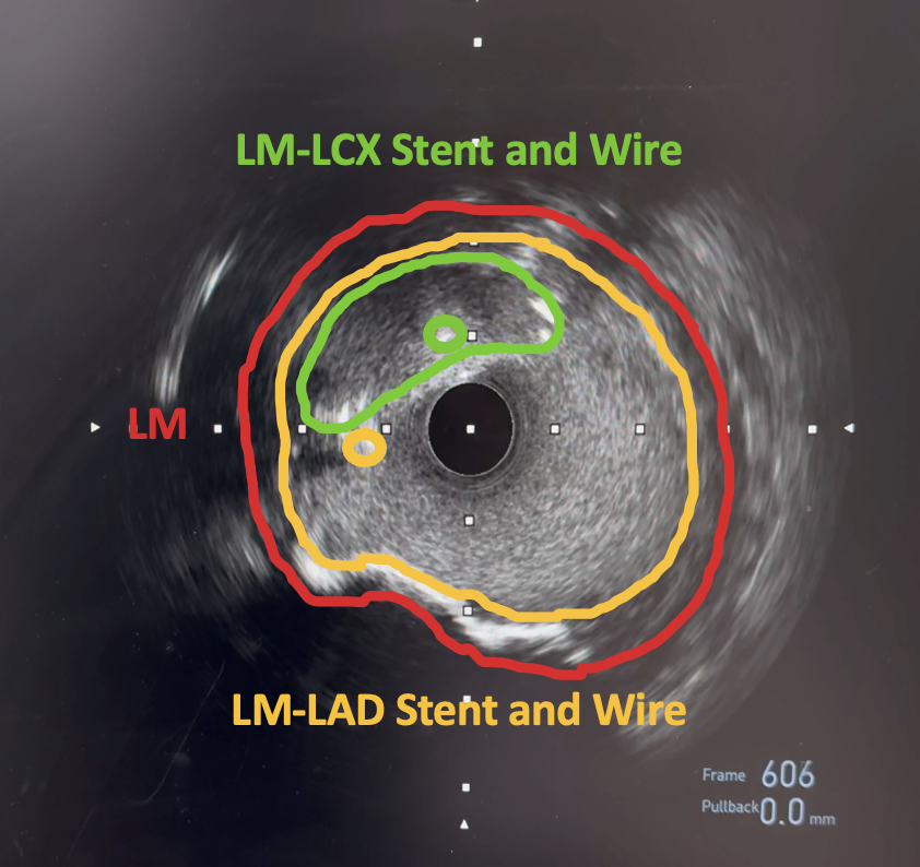 A 7F EBU 3.5 guide was used and an Asahi Sion Blue (Asahi Intecc, Japan) wire distalized into the LAD and a Sion wire crossed through the previous LM to LAD stent struts and distalized into LCX. After opening the stent struts, kissing balloon inflation (KBI) using a 3.5 mm balloon in the LM to LAD and a 2.5 mm balloon in the LM to LCX was done. IVUS showed LCX MLA of 3.48 mm2 and LAD MLA of 6.55 mm2. IVL in the LCX was done using a 3.0 mm IVL balloon for 8 cycles then in the LAD using a 4.0 mm IVL balloon for 5 cycles. A Xience Sierra (Abbott Vascular, USA) 3.0 mm x 33 mm stent was deployed at the LM to LCX then a POT at the LM. A Sion Blue was crossed through the LM to LCX stent struts and distalized into the LAD. Another KBI was done then a 4.0 mm DCB was deployed at the ostioproximal LAD for 1 minute. There was noted difficulty advancing the IVUS catheter past the proximal stent edge at the LM through the LM to LCX guidewire. IVUS of the LAD showed abluminal rewiring of the LAD stent resulting in an intraluminal jailing of the LCX wire and a stented double lumen LM. To resolve this, a Sion Blue was crossed through the LM to LCX stent struts through an Asahi Sasuke (Asahi Intecc, Japan) double lumen microcatheter and distalized into the LAD. Inflations with a 3.0 mm balloon at the LM to LCX were done followed by another KBI and finally POT at the LM. Final IVUS showed good stent expansion and apposition, LM MSA of 13.20 mm2, LAD MSA of 9.69 mm2, and LCX MSA of 6.23 mm2.