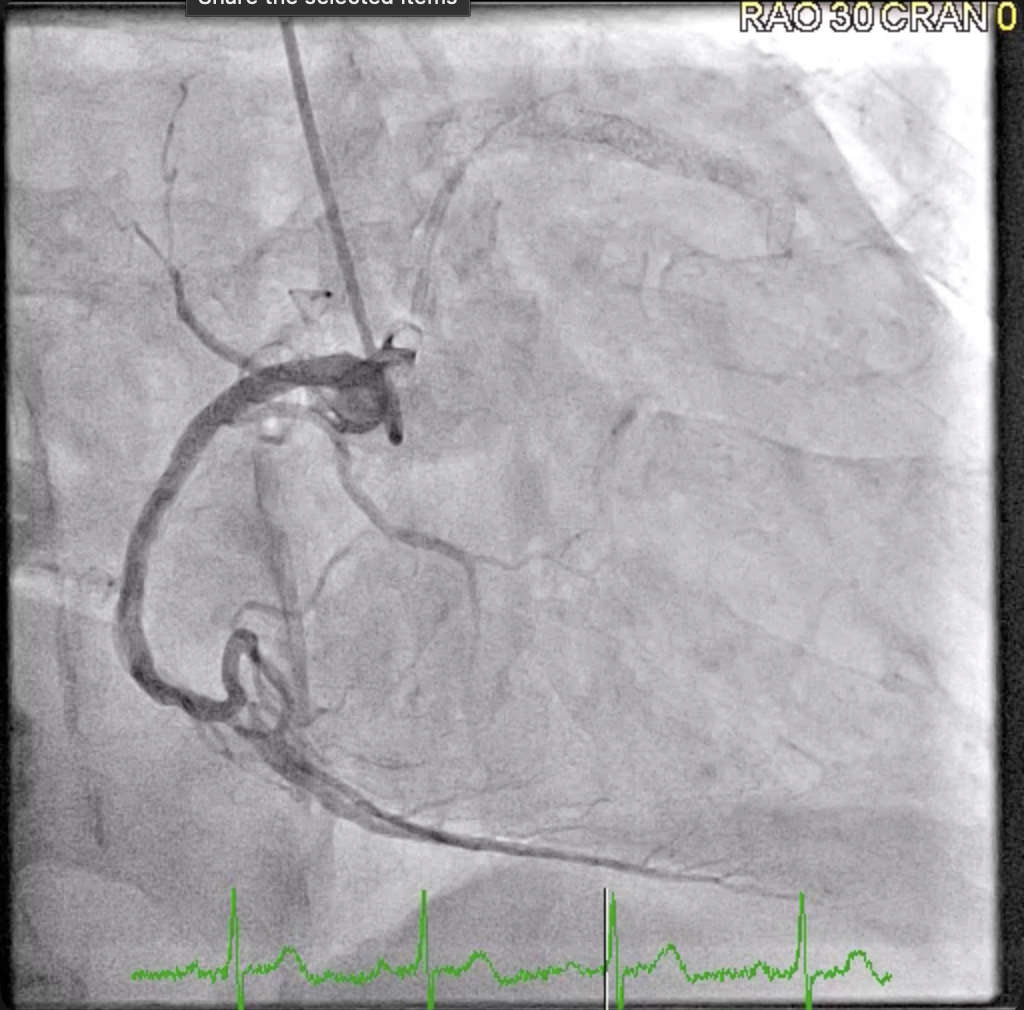 Coronary angiogram showed the LM as a good-sized vessel with luminal irregularities. The LAD is a good-sized Type III vessel with a 30% late in-stent restenosis at the proximal to mid segment. The D1 is a fair-sized vessel with a 40% proximal stenosis. The LCX is a good-sized non-dominant vessel with a 99% ostioproximal stenosis. The obtuse marginal branches are fair-sized with luminal irregularities. The RCA is a good-sized dominant vessel with a patent proximal stent and a 30% mid stenosis.