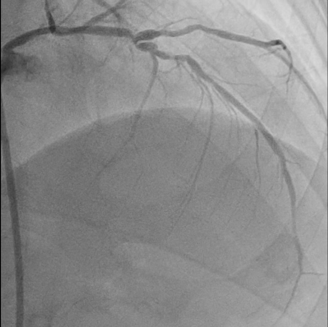 Coronary angiography examinationresults, we found patient with severe stenosis in proximal-mid LAD with tortuous andradiopacities seen before contrast injection in the arterial wall (tram-trackappearance) looks like calcifed lession and patent stent from Left main to LCx, non signifikan lession in right coronary artery.