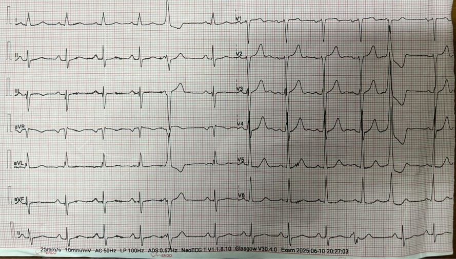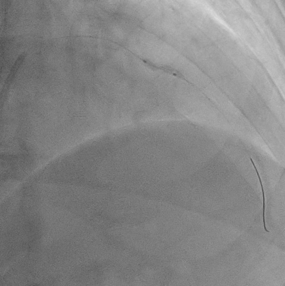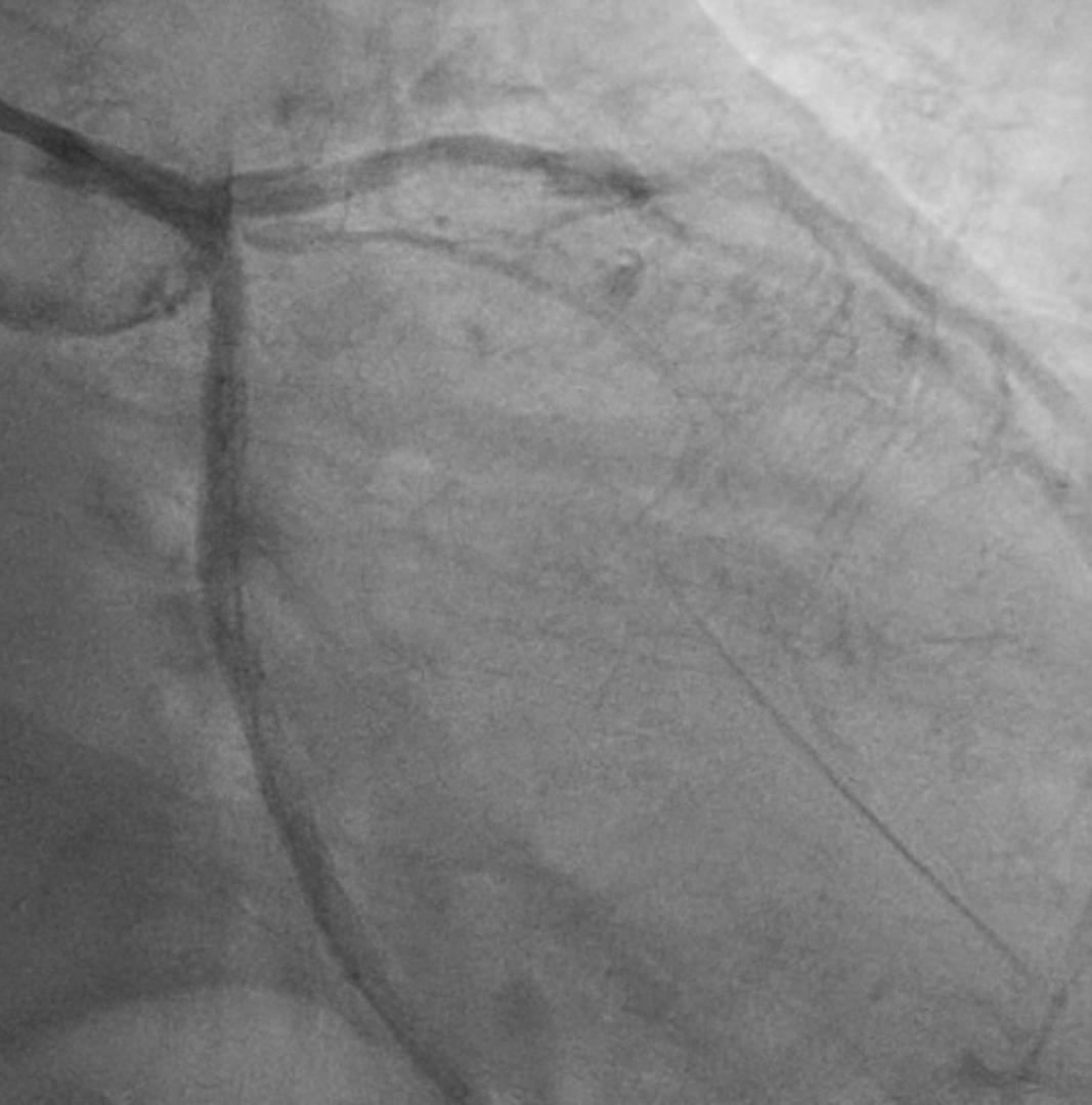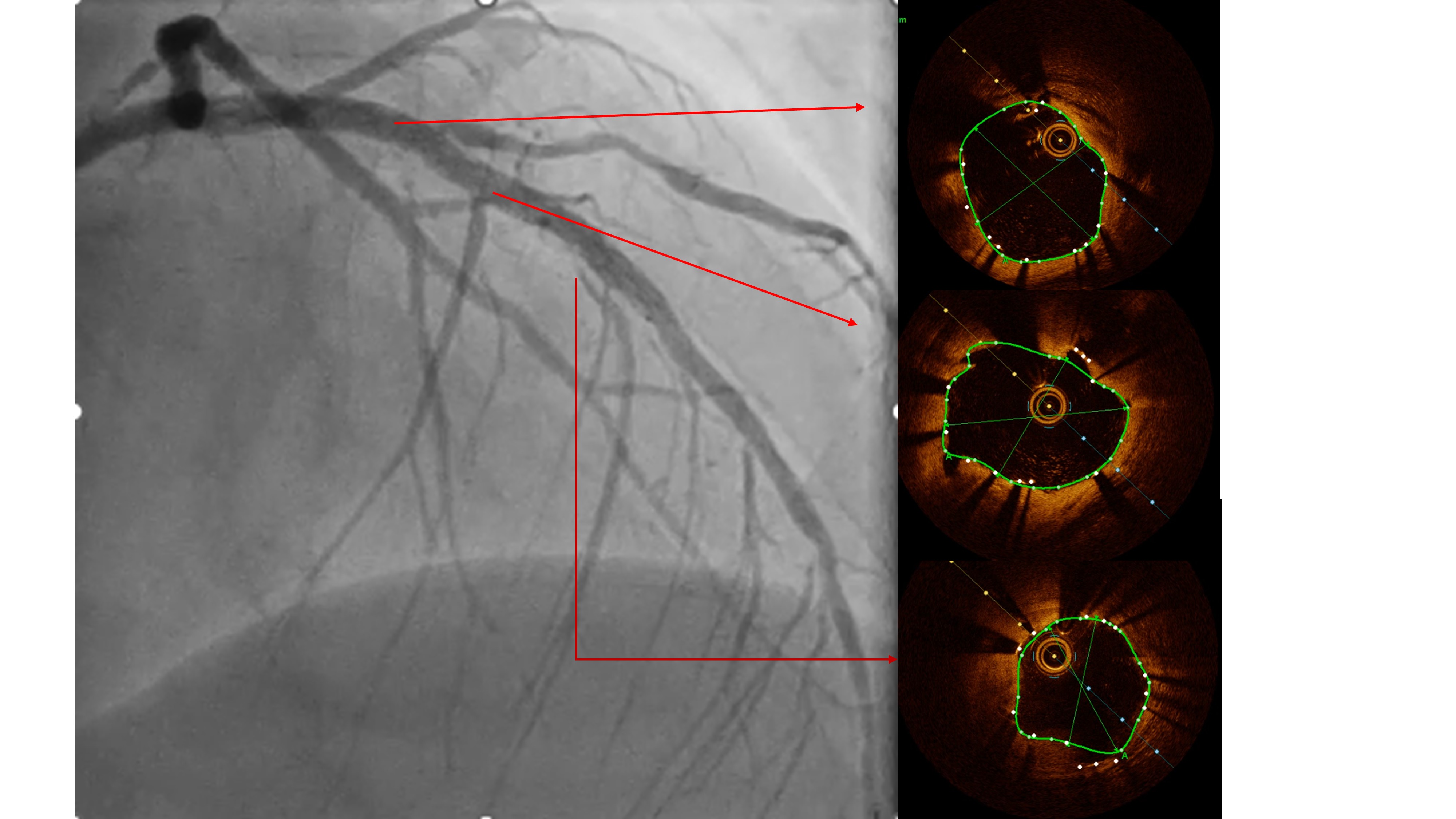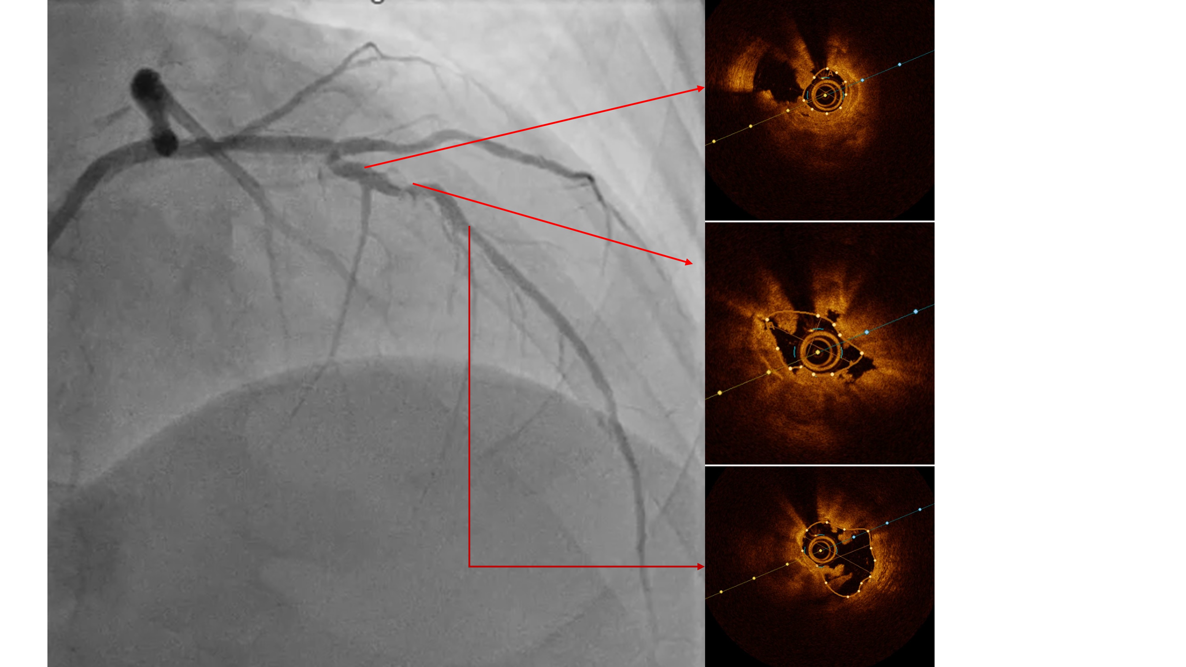 Two months ago, PCI of the LAD wasattempted. The guidewire successfully crossed to the distal LAD, but a 2.5 mmscoring balloon could not cross the mid lesion and showed a ¡°dog-bone¡±appearance upon inflation, so the procedure was stopped, and PCI of the LCx wasperformed instead. We reattempted PCI of the LAD using a Mach CLS 7 Fr guidingcatheter. A Fielder XT wire crossed to the distal LAD, but the OCT cathetercould not cross the lesion. Lesion preparation with a 2.0 mm scoring balloon athigh pressure and a 2.0 mm Wolverine cutting balloon enabled OCT passage. OCTimaging revealed fibrous and nodular calcification in the mid LAD, with aminimal lumen area of 1.71 mm and reference diameters of 4.0 mm (proximal) and3.3 mm (distal). Orbital atherectomy using a Diamondback 360 (1.25 mm crown)was performed carefully due to vessel tortuosity, with 10 runs at80,000–120,000 rpm. Post-atherectomy OCT showed reduced calcium burden andincreased lumen area. Further lesion preparation with 2.5 and 2.75 mm scoringballoons showed no ¡°dog-bone¡± sign, indicating adequate calcium fracture. A 3.0¡¿ 46 mm Amphilimus DES was implanted in the proximal–mid LAD and post-dilatedwith a 3.5 mm NC balloon. Final angiography showed TIMI 3 flow withoutdissection. Post-stent OCT showed good apposition, MSA 8.84 mm©÷ proximally and5.73 mm©÷ distally, with 99% expansion. The patient remained hemodynamicallystable and was discharged the following day.