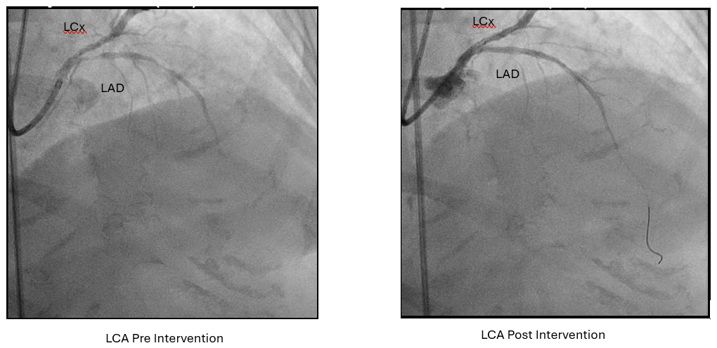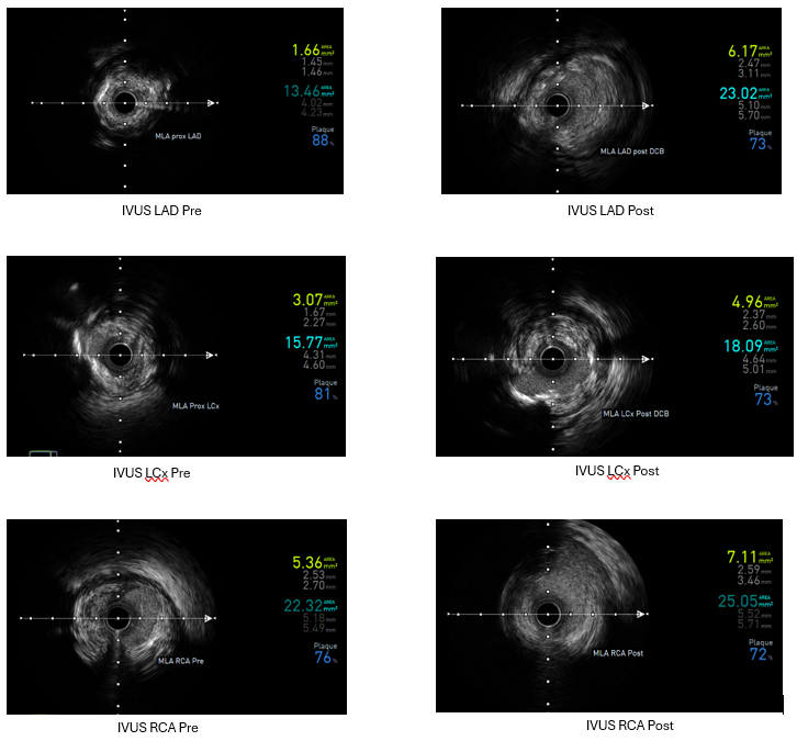 Angiography : LCA and RCA cannulation was confirmed by saline injection with ECG changes monitoring. 2 cc of contrast was pushed by 8 cc of saline for each view, with as minimal but optimal views as possible. Angiography roadmap was recorded. PCI LCA: Two workhorse wires was advanced to distal LAD and LCx using roadmap guidance. IVUS was inserted to evaluate morphology and length of LAD and LCx lesion as well as vessel size. The LAD IVUS results showed osteal-proximal fibrocalcified 90-180¡Æ with MLA of 1.66 mm2, while LCx IVUS also showed osteal-proximal fibrocalcified 180-270¡Æwith MLA of 3.07 mm2. Osteal-proximal LAD and LCX was then predilated with scoring balloon of 3.0x15 mm and 2.5x15 mm respectively, using guidewires as geometry guidance. IVUS evaluation suggested calcium crack, plaque dissection and lumen optimization. DCB 3.5x40 mm was then deployed at LM-LAD and DCB 3.0x40 mm at LM-LCx. One more view of low contrast angiography showed optimization of proximal LAD and LCx. IVUS evaluation showed MLA improvement from 1.66 to 6.17 mm2 (LAD) and 3.07 to 4.96 mm2(LCx). PCI RCA : Same approach was performed to RCA osteo-proximal lesion, predilatation using scoring balloon 4.0x12 mm followed by DCB 4.0x20 mm implantation, resulting with improvement in both angiography and IVUS evaluation (MLA improved from 5.36 to 7.11 mm2). Throughout of the procedure, only 18 cc of contrast were used.