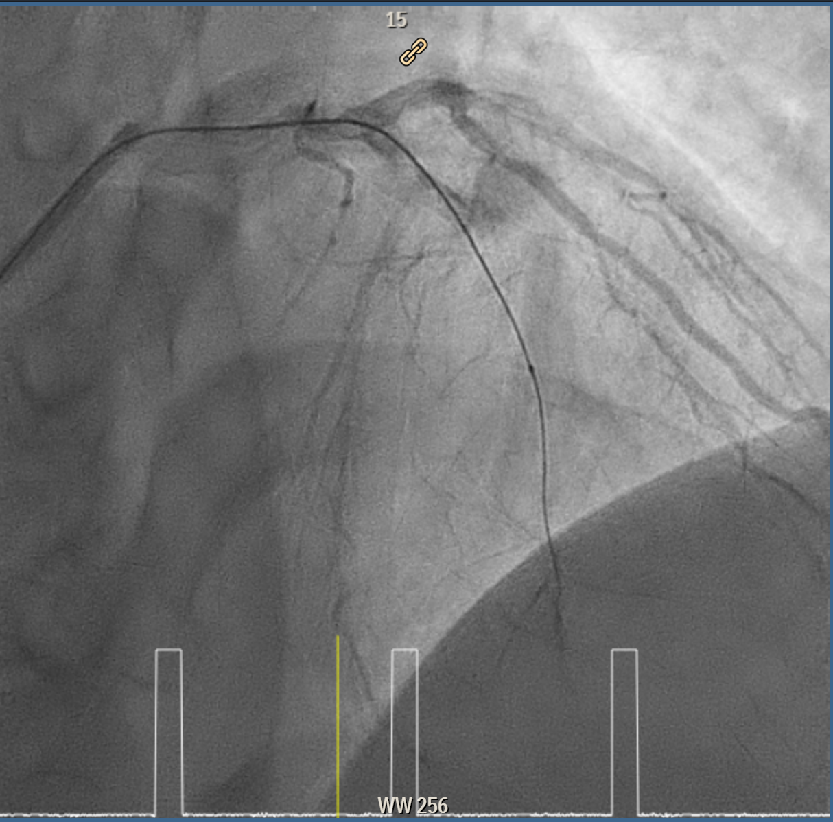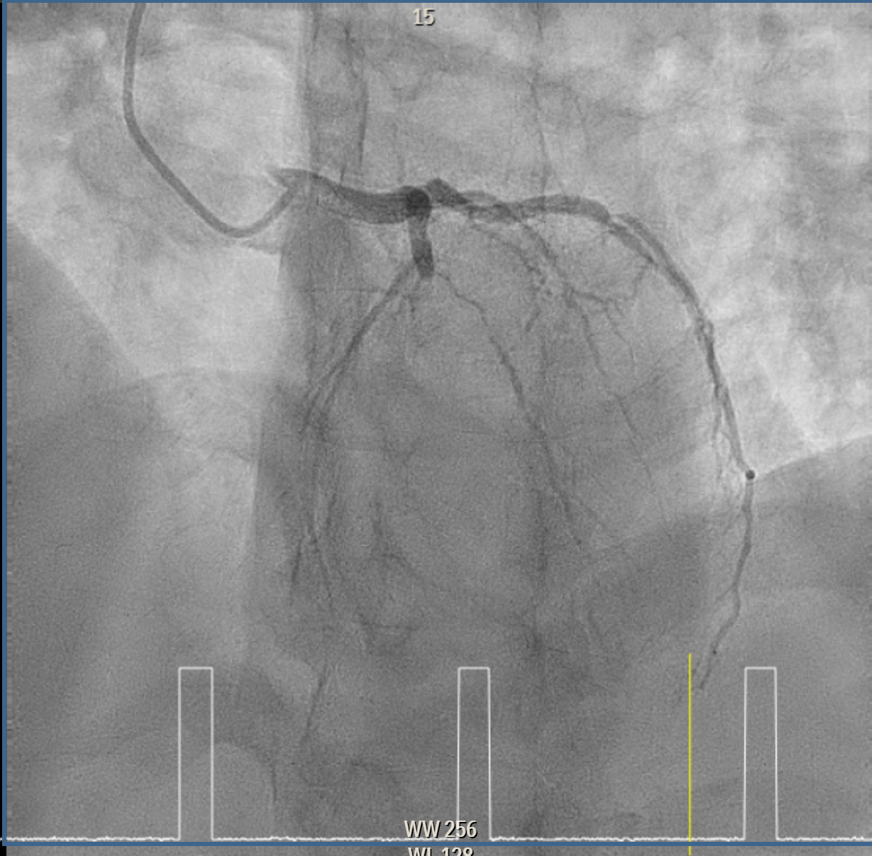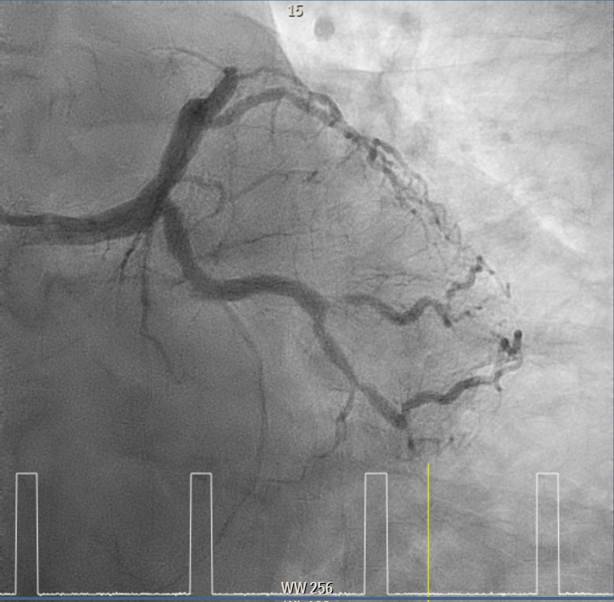 Elective angiogram was performed 3 months later as he declined procedure during index admission. Coronary angiogram showed total occlusion of proximal LAD at bifurcation of first diagonal and first septal branches. It received collateral supply from conus branch and first septal branch (Rentrop 2). J-CTO score was 2, and PROGRESS-CTO score was 1, indicate moderate complexity. Additionally, RCA was huge and dominant, while proximal first OM branch of LCX was 80–90% diseased.