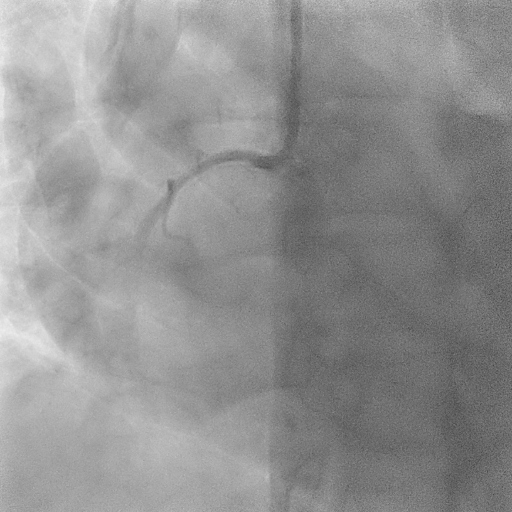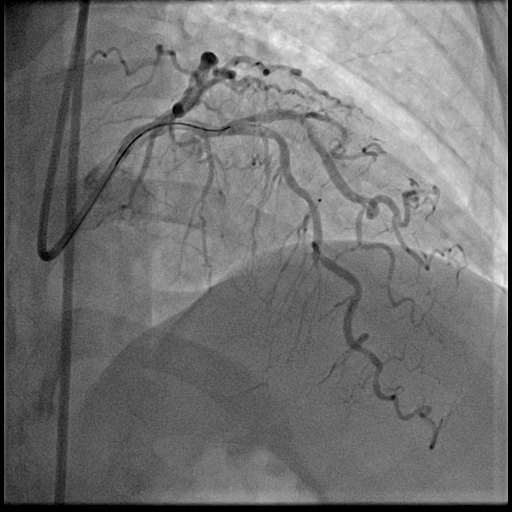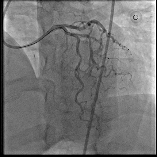 The coronary angiogram showed a right-dominant system. The right coronary artery (RCA) had a patent mid stent with mild diffuse disease and good TIMI 3 flow. The Quantitative Flow Ratio (QFR) was 0.97, indicating preserved physiological flow. A dual LAD anatomy was noted with significant bifurcation lesions (Medina 1,1,1) involving the mid first LAD and the ostial to mid second LAD. The non-dominant left circumflex artery and left main stem were normal.