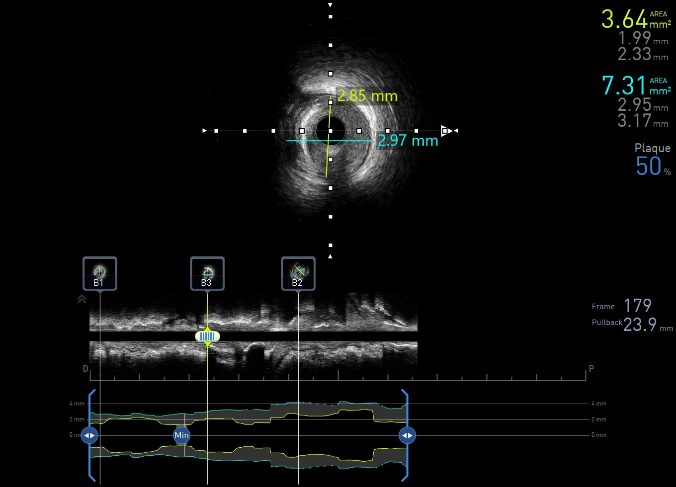 Coronary intervention was performed using an EBU 3.0, 6 Fr guiding catheter via the right radial artery approach. A Runthrough Floppy wire was advanced to the distal first LAD, and a Sion Blue wire to the second LAD. Pre-dilatation of the mid first LAD was performed using a semi-compliant (SC) 2.0 ¡¿ 15 mm balloon at high pressure. Intravascular ultrasound assessment revealed fibrocalcific plaque in both vessels. The vessel reference diameter of the first LAD measured 2.5 mm distally and 3.0mm proximally, with a minimal lumen area of 5.5–6.0 mm©÷ at the ostial segment. The second LAD had a vessel reference diameter of 2.5 mm distally and 2.75 mm proximally. Pre-dilatation of the second LAD was performed using a SC balloon at nominal pressure. Vessel preparation of the first LAD was then performed using a non-compliant (NC) 2.0 ¡¿ 10 mm balloon, followed by a scoring balloon(2.5 ¡¿ 15 mm) inflated at high pressure. The lesion was adequately prepared with minimal recoil and a type B non–flow-limiting dissection observed indicating adequate vessel preparation before DCB angioplasty. Two drug-coated balloons were inflated in the first and second LAD at nominal pressure for 45 seconds each. Similar non–flow-limiting type B dissections were observed in both LADs, with minimal recoil. Final angiographic results were satisfactory showing TIMI 3 flow with no immediate complications. The patient remained asymptomatic and discharged well the following day.