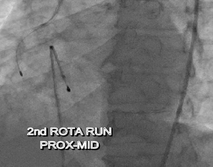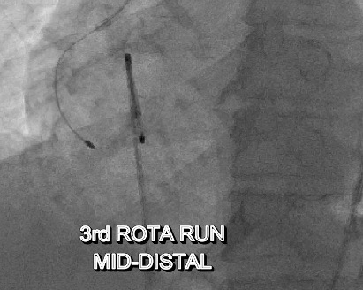 A 6F JR guiding catheter was engaged at the RCA ostium. The lesion was initially crossed using a Sion Blue wire, which was parked distally into the posterior descending artery (PDA).A 0.75 mm CTO balloon was then advanced but failed to cross the heavily calcified lesion. The wire was subsequently exchanged for a RotaWire, and rotational atherectomy was performed in three sequential runs: