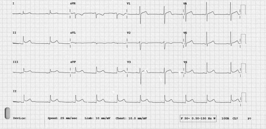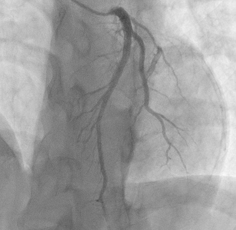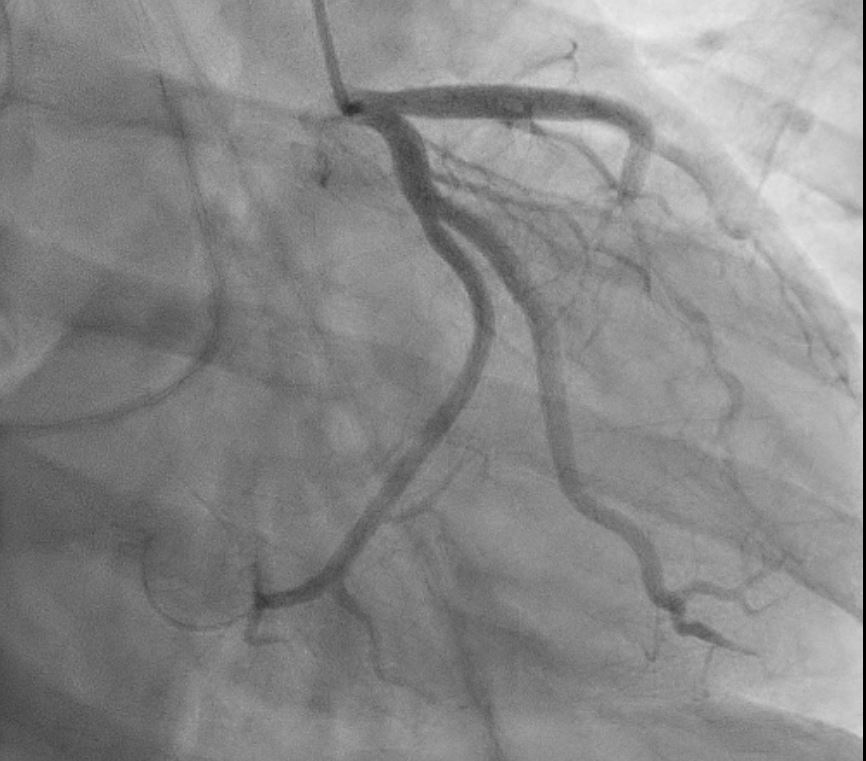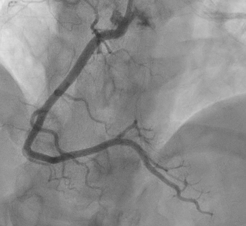 29 year-old man, active vaper, no known medical illness, presented to General Hospital with acute onset of left sided chest pain, radiated to the left upper limb. ECG showed ST elevation I, II,III, AVF and AVL without posterior involvement. He was diagnosed to have acute inferior Myocardial Infarction and referred to our center for primary PCI.On arrival to Emergency department, he was relatively comfortable. BP: 129/60. HR 110bpm, SPO2 100% under room air. CVS Dual rhythm no murmur Lungs clear