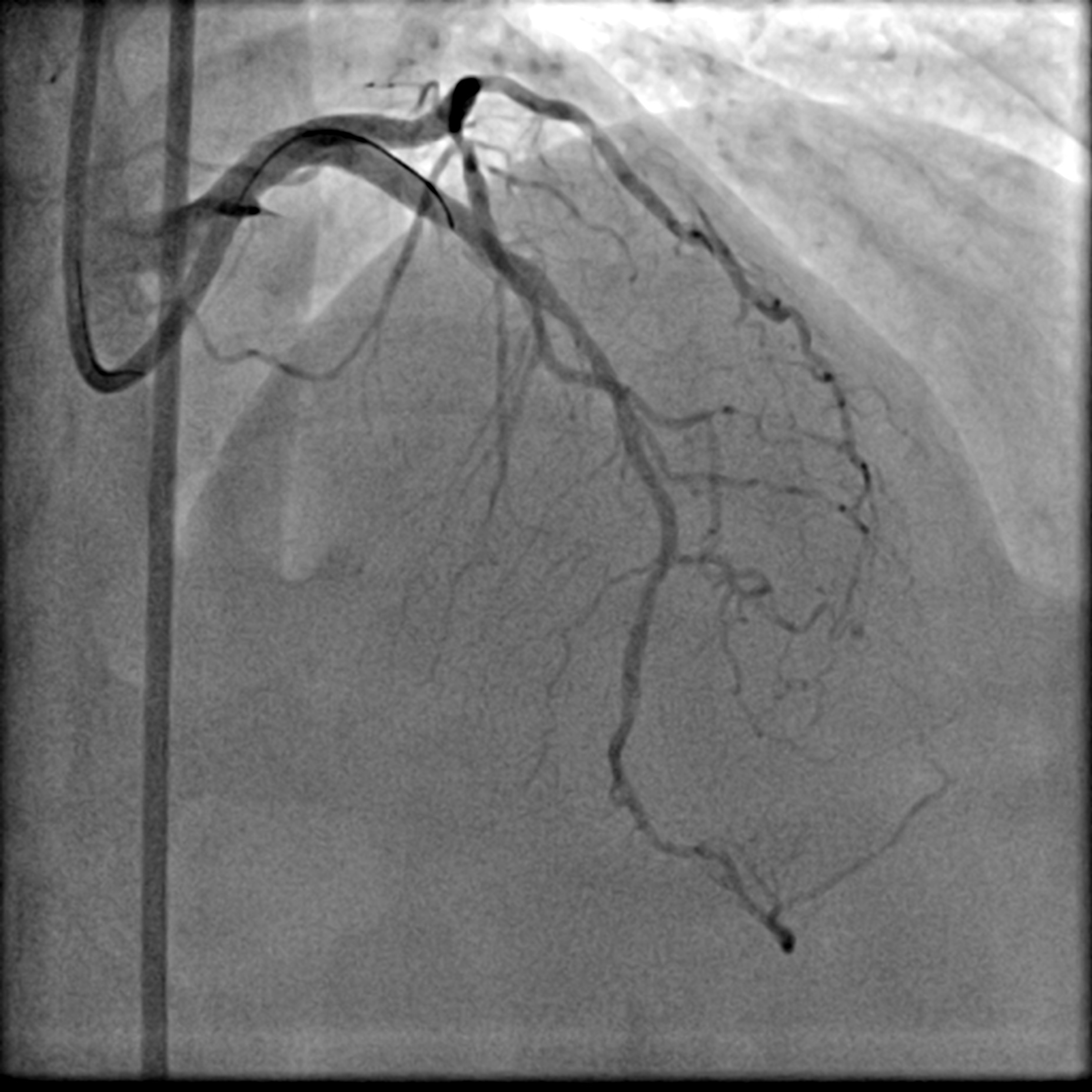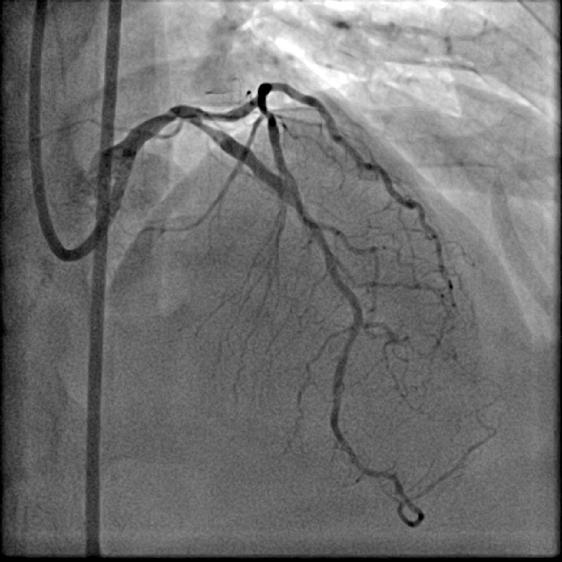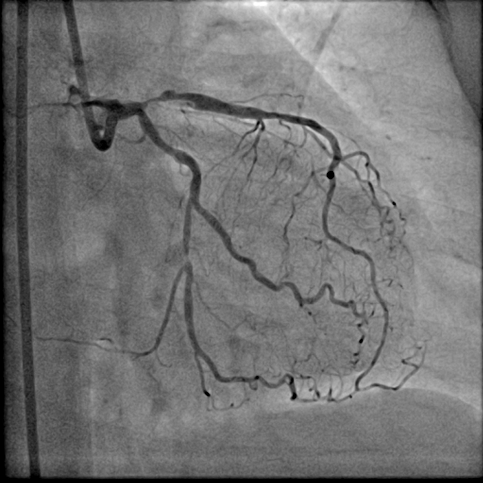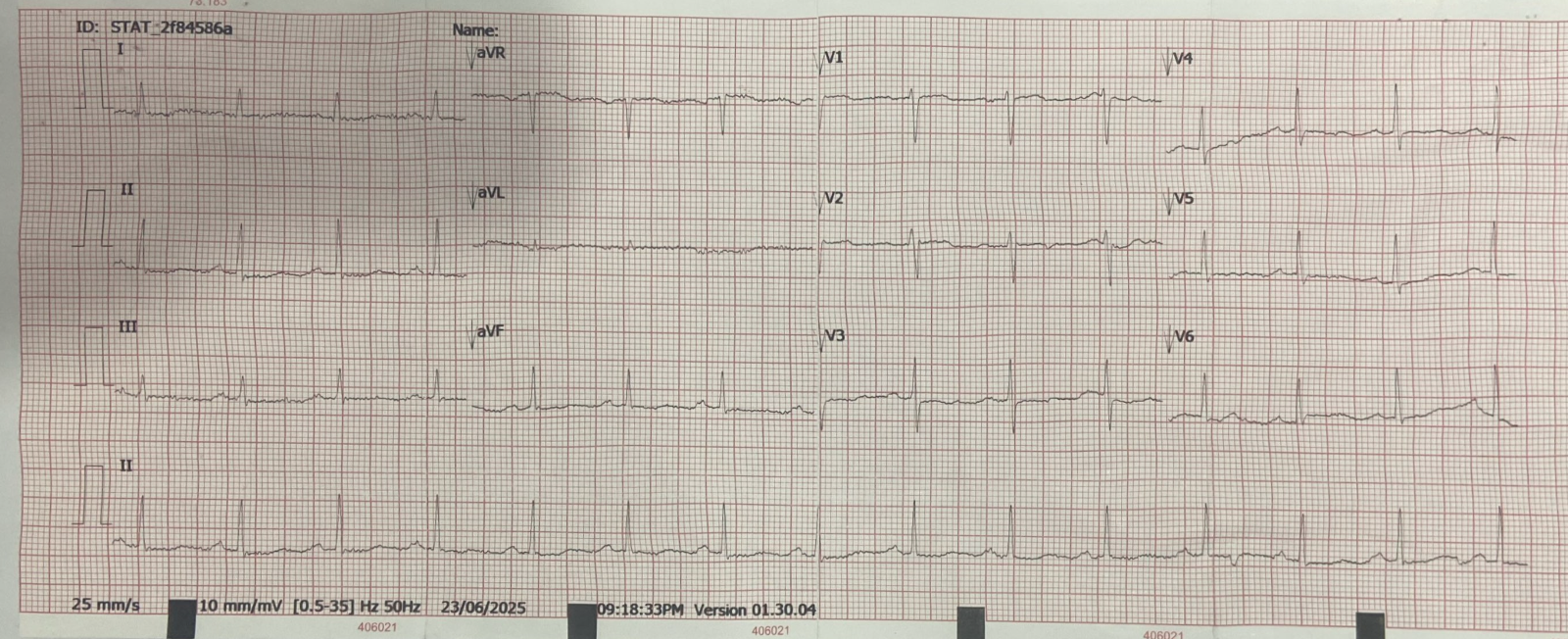 The patient is a 62-year-old female with cardiovascular risk factors including hypertension, Type 2 Diabetes Mellitus requiring oral medication, dyslipidemia, and well-controlled bronchial asthma. She presented with three days of angina, associated with diaphoresis and palpitations. She did not report symptoms of heart failure. During the initial presentation, she was not in shock. Her initial electrocardiogram (ECG) showed subtle generalised ST depression with reciprocal ST elevation over AVR.