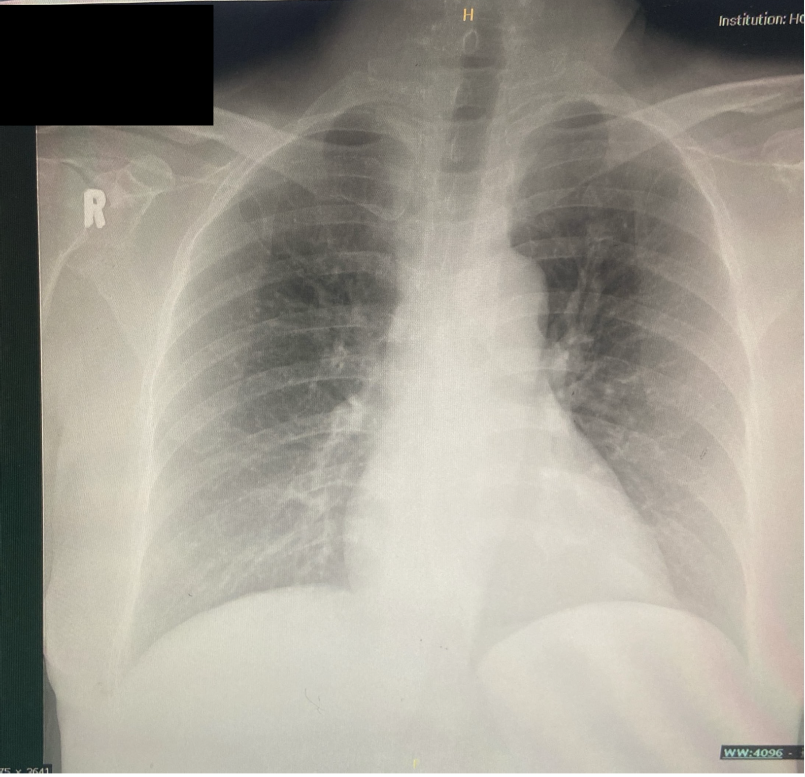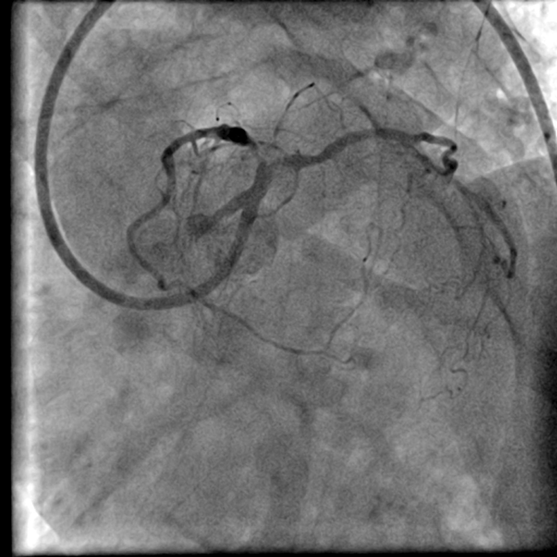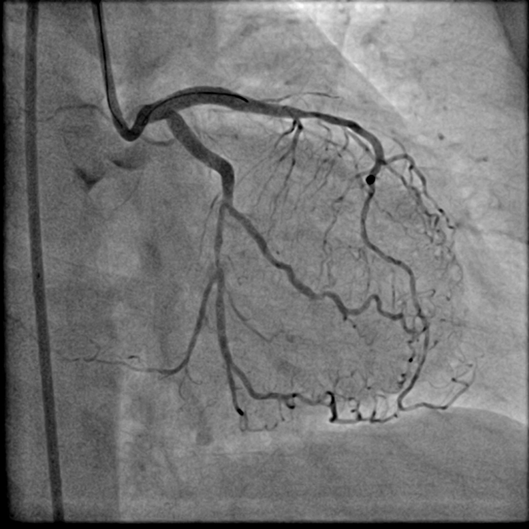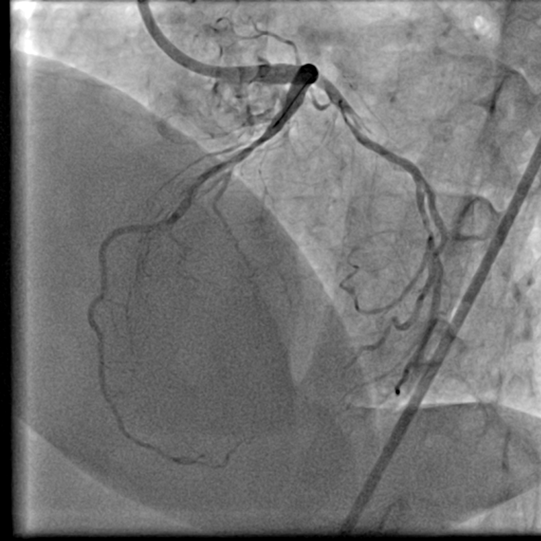 The patient is a 62-year-old female with cardiovascular risk factors including hypertension, Type 2 Diabetes Mellitus requiring oral medication, dyslipidemia, and well-controlled bronchial asthma. She presented with three days of angina, associated with diaphoresis and palpitations. She did not report symptoms of heart failure. During the initial presentation, she was not in shock. Her initial electrocardiogram (ECG) showed subtle generalised ST depression with reciprocal ST elevation over AVR.