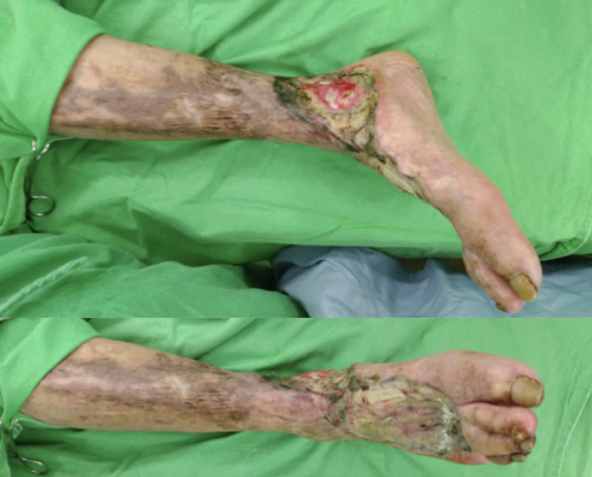 An 82-year-old male with chronic Critical Limb Ischemia (CLI) (PAOD Fontaine IV/Rutherford 6) was urgently admitted with an infected, non-healing right ankle wound and tendon exposure. The presentation was complicated by fever, tachycardia, a cold extremity, and nonpalpable pedal pulses, indicating critical infection and ischemia. Management was challenging due to the patient's self-discontinuation of anti-platelets following recent bleeding.