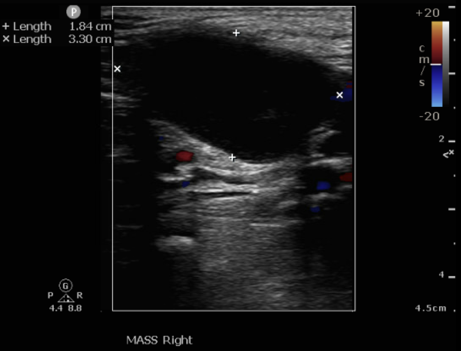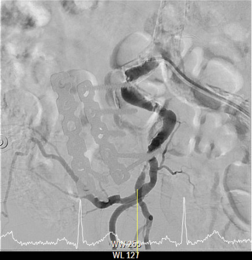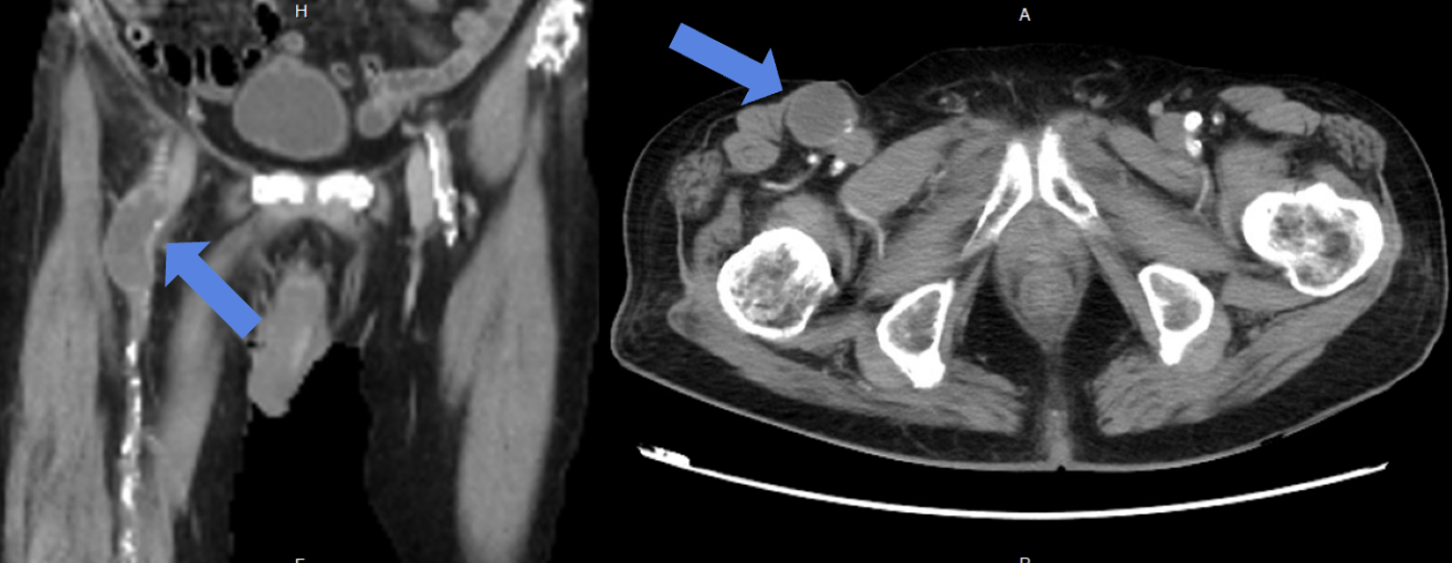 Lab data showed leukocytosis and significantly elevated C-Reactive Protein, alongside deteriorated renal function. Vascular Duplex showed monophasic flow and a hematoma near the Common Femoral Artery (CFA). CTA revealed Severe PAOD via extensive total occlusion from the right right External Iliac Artery (EIA) to the Superficial Femoral Artery (SFA), and a thrombosed aneurysm at the femoral bifurcation, and extensive Deep Venous Thrombosis (DVT) extending from the femoral vein distally.
