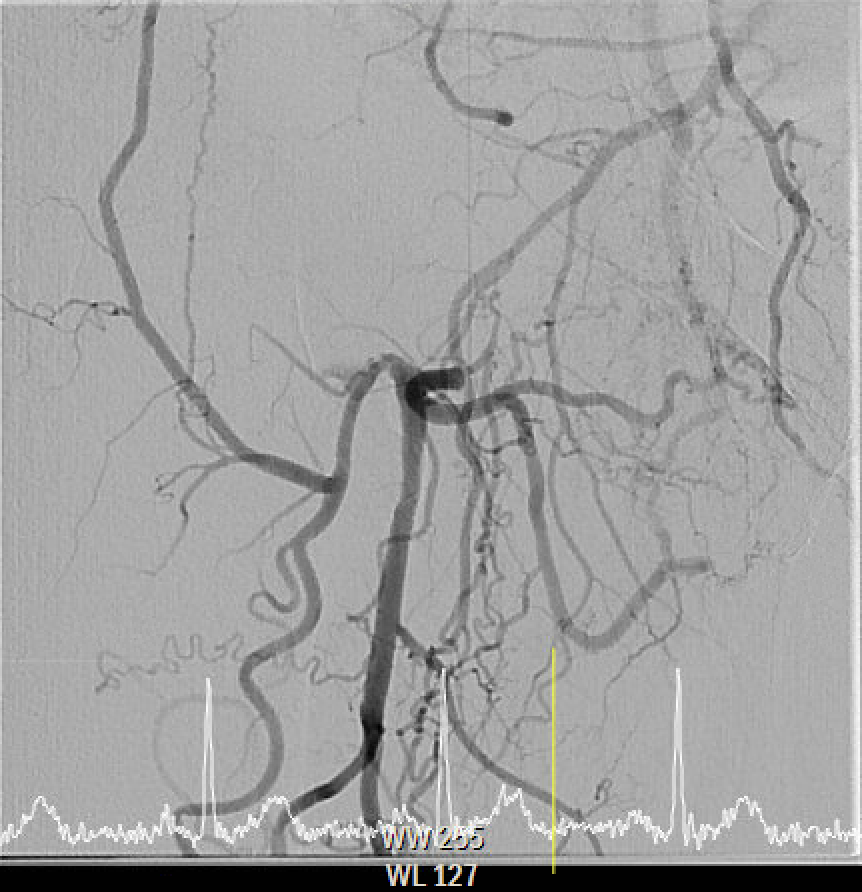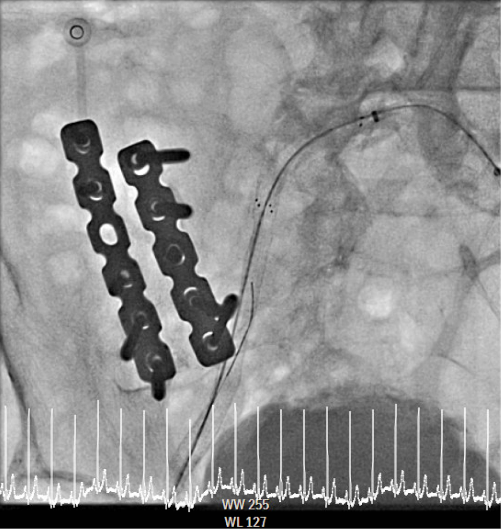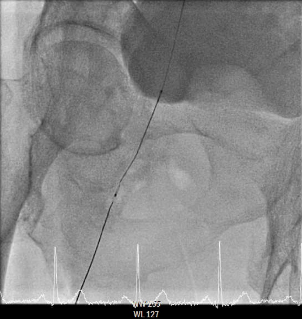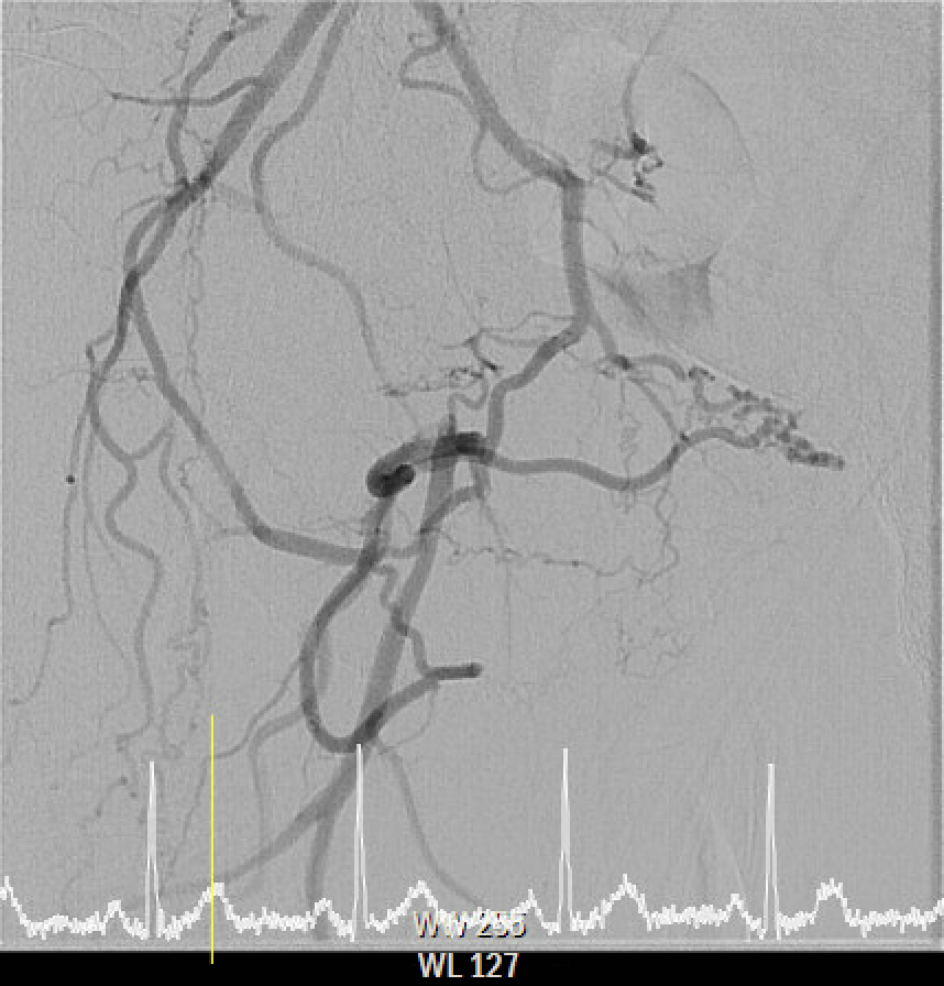The angiography confirmed extensive Chronic Total Occlusion (CTO) of the right External Iliac Artery (EIA), Common Femoral Artery (CFA), and proximal Superficial Femoral Artery (SFA). The limb's circulation was critically dependent on collateral flow: the Deep Femoral Artery (DFA) was patent and supplying the distal SFA. Distally, a 50% stenosis was noted in the Popliteal Artery, but the Below-the-Knee (BTK) arteries were patent.