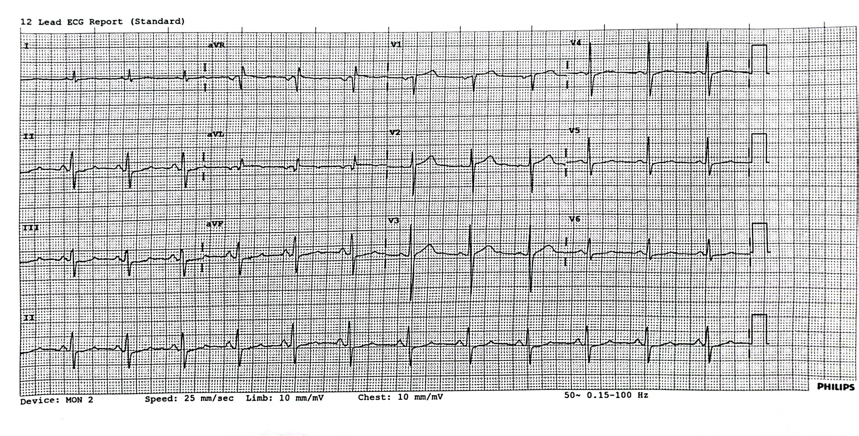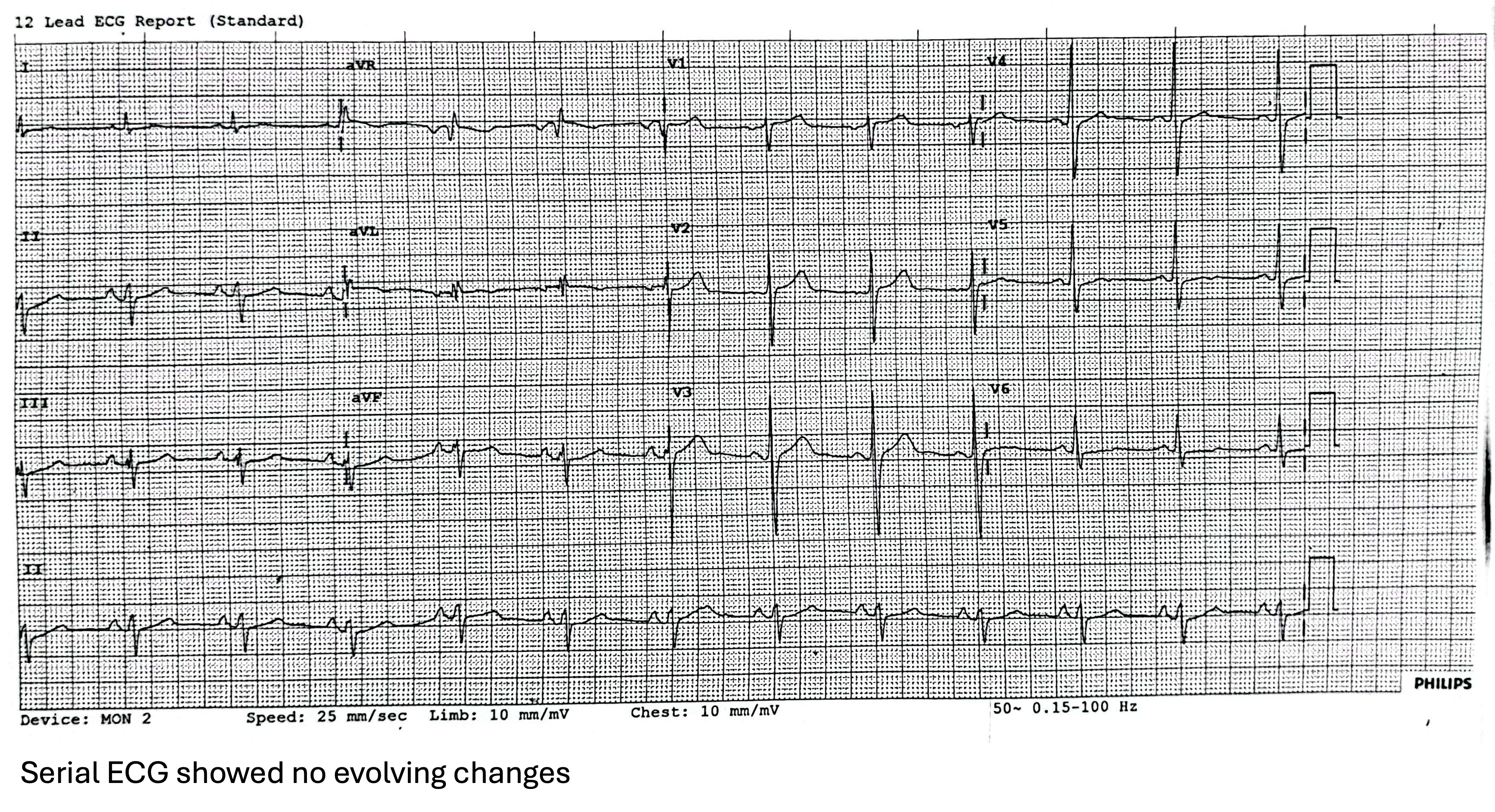 WBC 5.7 x 109/L; Hb 14.5 g/dL; Platelet 269 x 109/LNa 140 mmol/L; K 3.8 mmol/L; Cl 107 mmol/L; Urea 4.4 mmol/L; Creatinine 75 umol/LTroponin I < 3.7 ng/L Creatinine kinase 78 U/L --> 70 U/LECG: sinus rhythm.