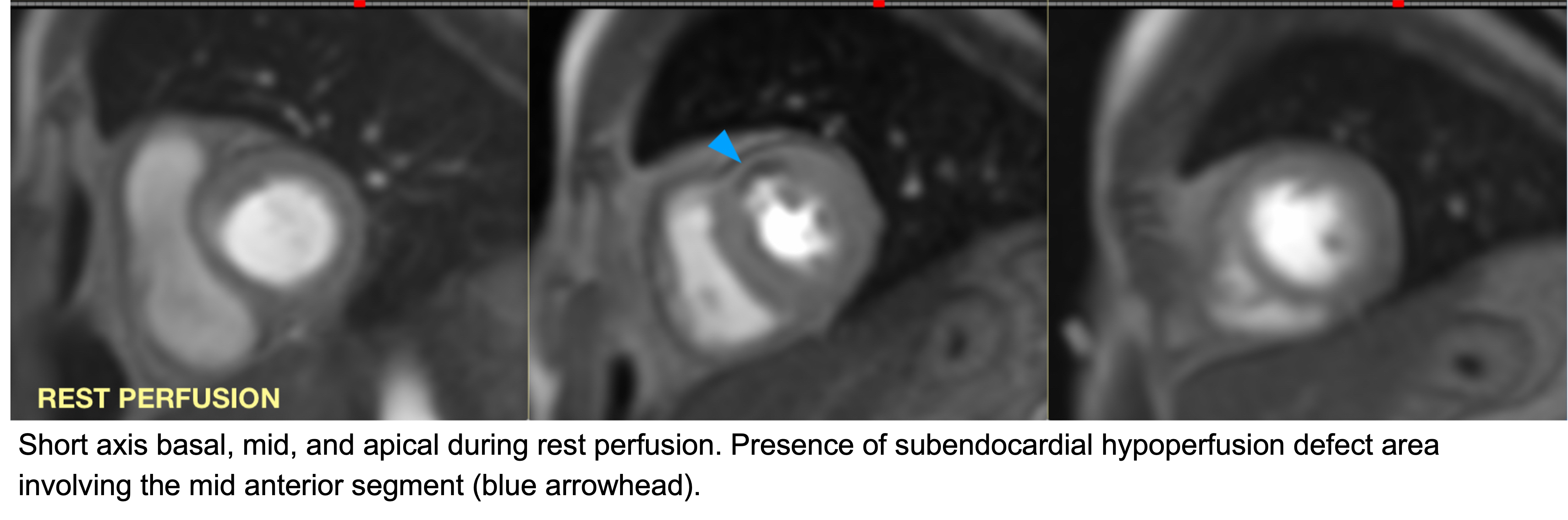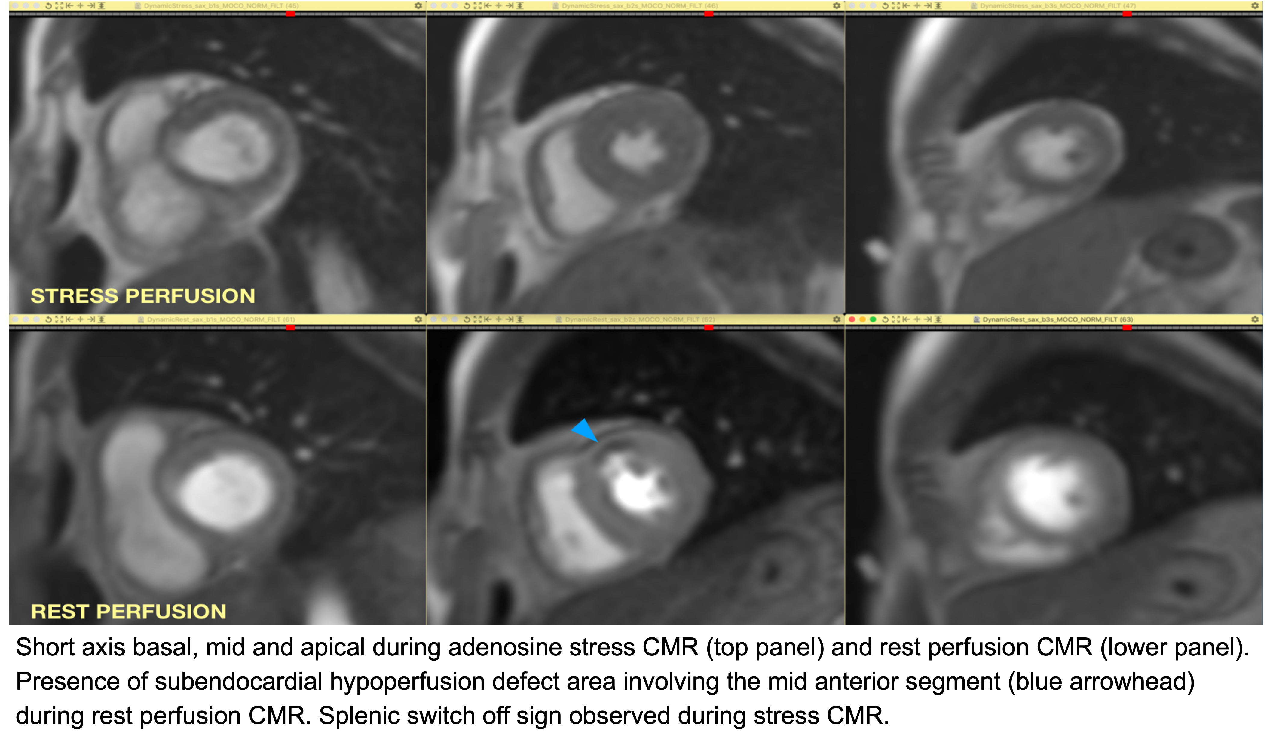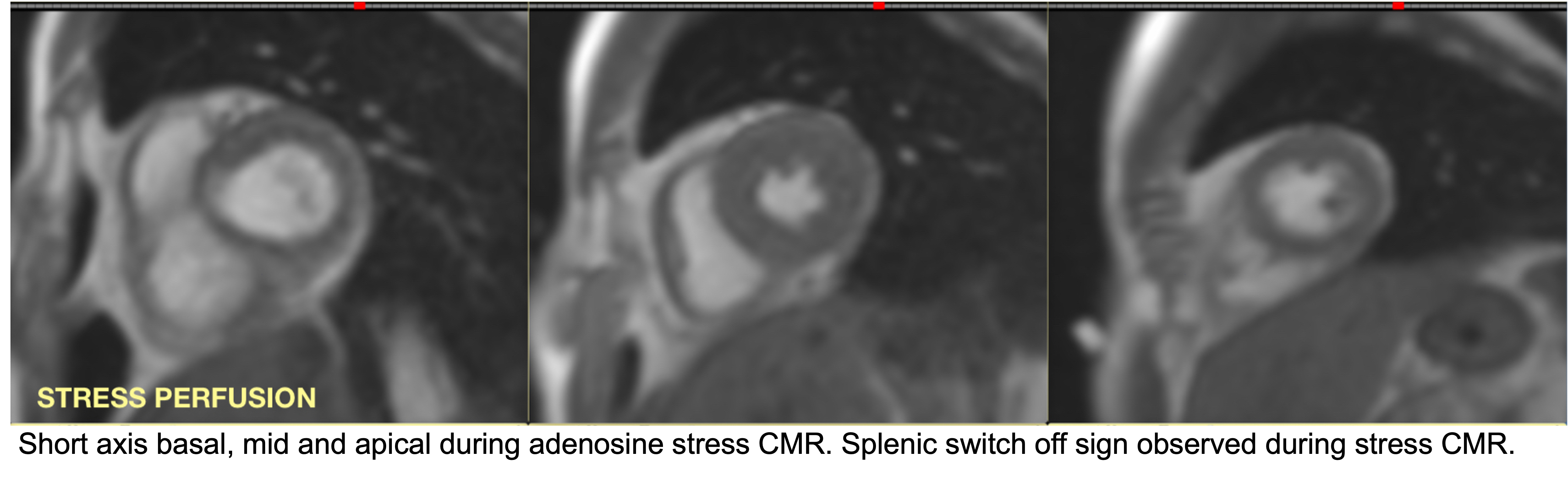 Cardiac magnetic resonance imaging (CMR): rest perfusion CMR demonstrated a mid-anterior hypoperfusion defect, consistent with adenosine-induced coronary vasospasm.