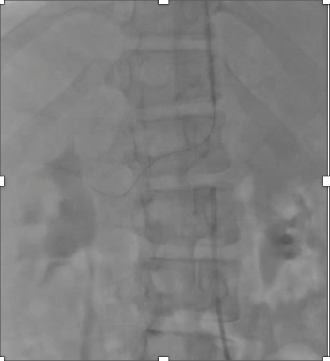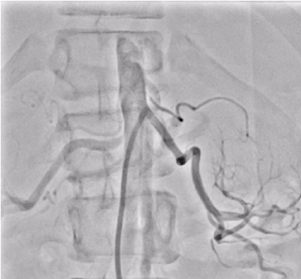 Six french femoral arterial sheath was placed under ultrasound guided. Renal angiogram using 6 Fr Renal Double Curve catheter showed normal left renal artery and subtotal occlusion near at the ostium of right renal artery.