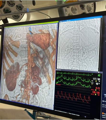 Despite having an overlay from three dimensional three dimensional fusion imaging, it was difficult to wire the right renal artery. Five French right brachial arterial sheath was introduced under ultrasound guided. Polymer jacket coronary guide wire was used under two dimensional three dimensional fusion imaging. Wiring was finally succeeded with the support of JR 3.5/ 5 Fr guiding catheter from the brachial access. Lesion was predilated using 2.0 x 15 mm and 4.0 x 15 mm semi compliant coronary balloons. Drug eluting stent of 4.0 x 15 mm was implanted and post dilated using 4.5 x 12 mm non compliant coronary balloon. The procedure was uneventful. Fluoroscopy time was 53.16 minutes, contrast volume was 130 cc, radiation dose was 83.88 mGy.