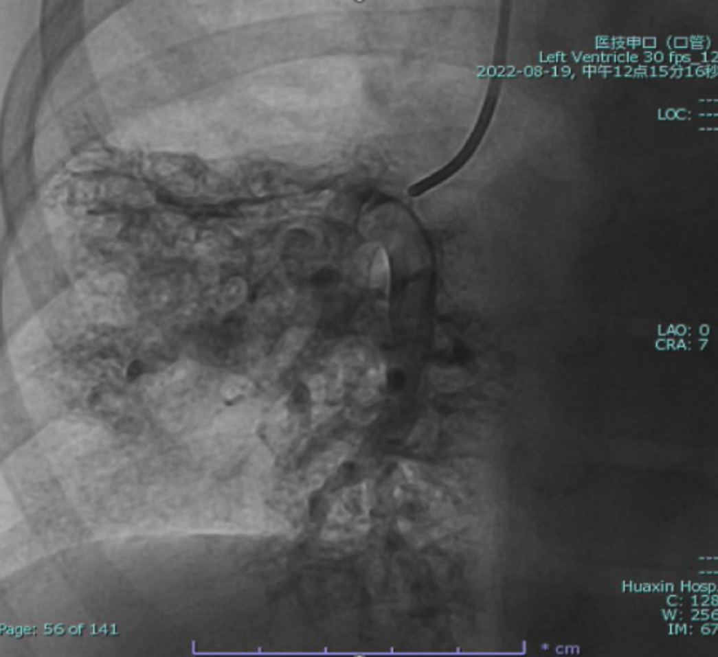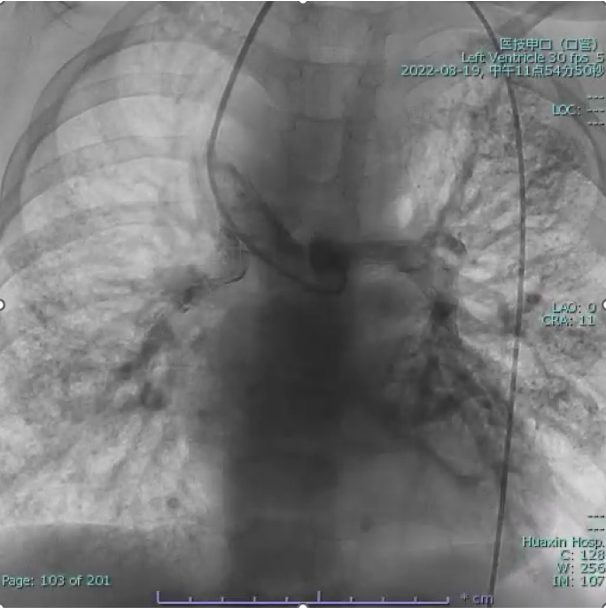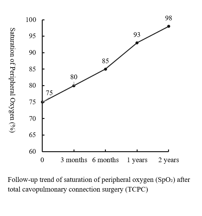 The operation was performed via a median sternotomy. Intraoperative exploration revealed that the ventricular septal defect was located in the inflow tract, distant from the aortic valve, making intracardiac tunnel construction infeasible; therefore, biventricular repair was not feasible. Under general anesthesia with hypothermic cardiopulmonary bypass, a total cavopulmonary connection (TCPC) was performed. The inferior vena cava was transected, and an 18-mm Gore-Tex conduit was anastomosed end-to-side to the right pulmonary artery, establishing a complete cavopulmonary circuit. Immediate postoperative oxygen saturation was approximately 75%. The total operative time was 6 hours and 14 minutes, with an aortic cross-clamp time of 50 minutes. The patient remained in the intensive care unit for 8 days and was discharged on postoperative day 19 after an uneventful recovery and stable hemodynamics. During a 2-year follow-up, peripheral oxygen saturation gradually increased and stabilized at 97–100%, with markedly improved exercise tolerance, resolution of digital clubbing, and normal skin color. Repeat cardiac catheterization confirmed unobstructed conduit flow and well-developed pulmonary vasculature. The previously extensive bilateral pulmonary arteriovenous malformations had completely resolved, pulmonary circulation time normalized, and pulmonary artery pressures measured 13/11/12 mmHg.