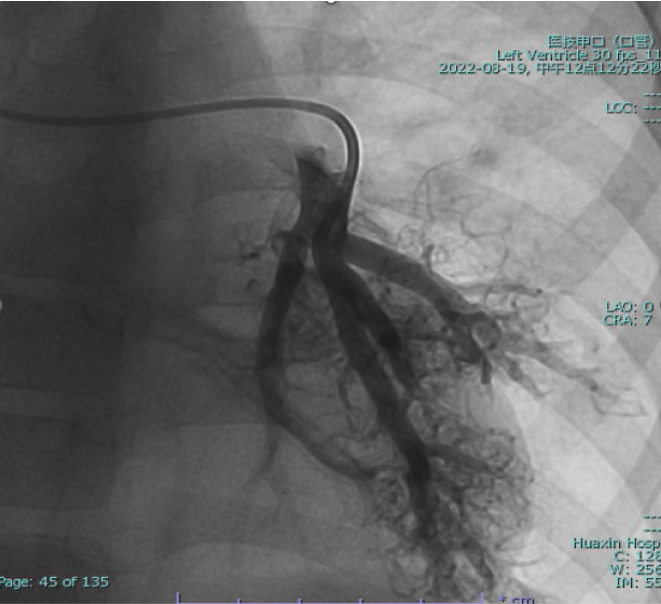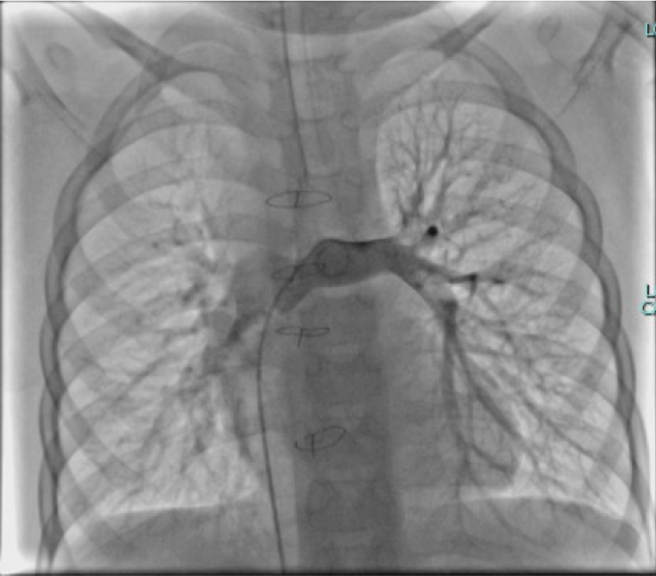 Cardiac catheterization confirmed absence of antegrade pulmonary flow with well-developed bilateral pulmonary arteries. Distal pulmonary arteries and pulmonary venous branches were markedly dilated, some showing a granular or ¡°string-of-beads¡± appearance. Pulmonary circulation time was shortened, indicating significant right-to-left intrapulmonary shunting consistent with diffuse PAVMs. Pulmonary artery pressure was 17/9/13 mmHg.