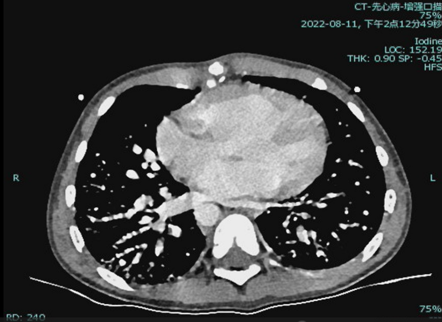 Laboratory testing showed hemoglobin 225 g/L and hematocrit 73.3%. Arterial blood gas revealed PO©ü 30.7 mmHg and SO©ü 58.1%. Chest X-ray showed cardiomegaly (cardiothoracic ratio 0.6) and increased pulmonary markings. Echocardiography demonstrated a patent Glenn anastomosis. Contrast-enhanced CT revealed absence of the main pulmonary artery and diffuse pulmonary arteriovenous malformations (PAVMs) in both lungs, most prominent in the lower lobes.