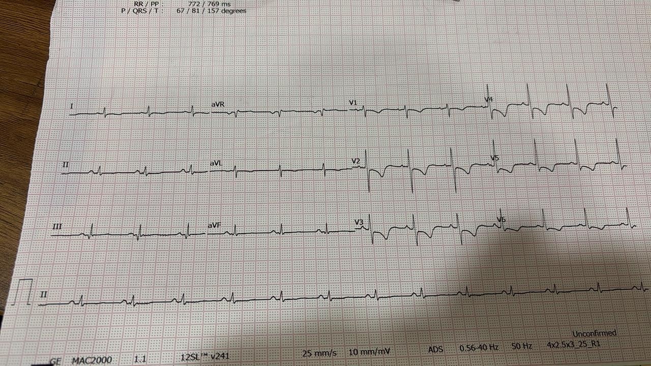 72 year old man post-CABG LIMA->LAD, SVG->D1, PDA in 2008 and PCI->RCA and ramus 2019 presented with intermittent lower chest discomfort with multiple episodes of vomiting and fatigue. He had past history of left thalamic infarct in 2022 and right corona radiata infarct in 2024. He had diabetes, hypertension, and atrial fibrillation in a previous holter. On examination he was conscious, alert, BP 130/90, PR 112/min, regular, heart sounds normal, respiratory system examination normal.
