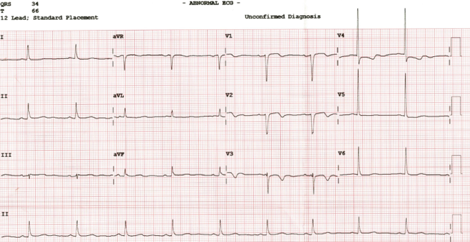 Investigations revealed sinus rhythm with poor R-wave progression and T-wave inversion in leads V1–V4 on ECG. Echocardiography demonstrated a left ventricular ejection fraction of 35–40% with hypokinesia of the anterior and antero-septal walls. Laboratory studies showed hemoglobin of 11.2 g/dL, platelet count of 270 ¡¿10⁹/L, and an eGFR of 20 ml/min/1.73m©÷.