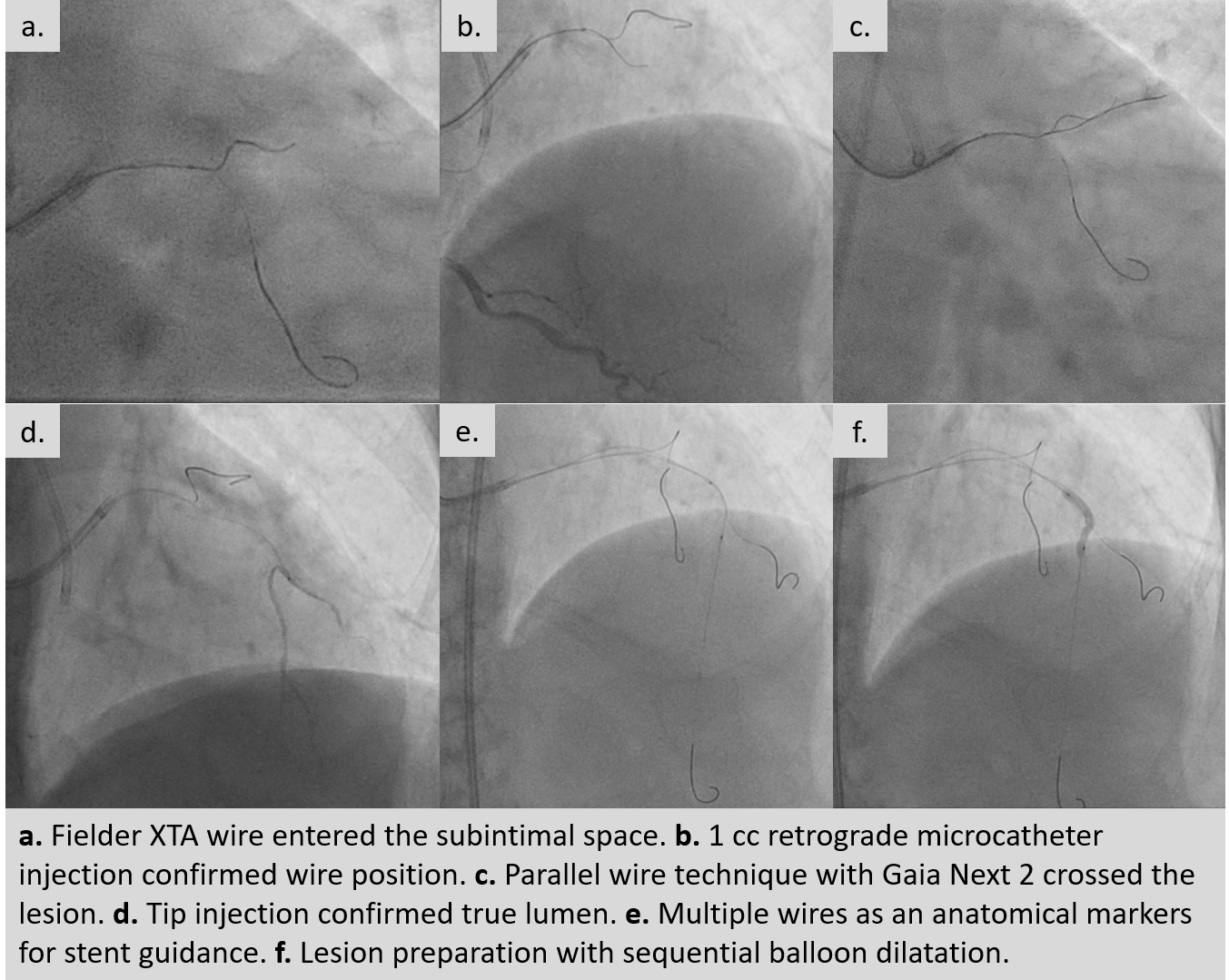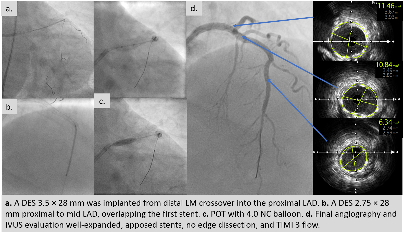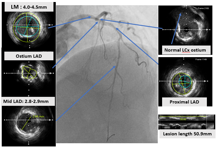 An ultra low contrast PCI of the LAD was performed using dual puncture with EBU 3.5/7F and JR 3.5/6F catheters via radial and femoral access. Saline was used for engagement, with contrast restricted to microcatheter injections of 1 cc each as a sparing strategy. Antegrade proximal cap puncture with Finecross and Fielder XTA tracked subintimally, and a parallel wire technique with Gaia Next 2 successfully crossed the lesion, confirmed by retrograde injection. Lesion preparation was achieved with a semicompliant balloon (2.5 ¡¿ 15 mm) from mid to proximal LAD and a cutting balloon (2.75 ¡¿ 18 mm) from mid to ostium LAD. IVUS pullback revealed a long diffuse lesion with proximal and ostial calcification, showing calcium cracks after preparation. MLA at the ostium LAD was 2.5 mm©÷, distal reference diameter 2.8 mm, and LM diameter 4.5 mm. Stent deployment was guided by multiple wires as anatomical landmarks without contrast. A DES (3.5 ¡¿ 28 mm) was implanted from distal LM crossover to proximal LAD, followed by POT with a 4.0 ¡¿ 9 mm NC balloon. A second DES (2.75 ¡¿ 28 mm) was placed in proximal to mid LAD overlapping the first, with post-dilation using a 3.0 ¡¿ 15 mm NC balloon. IVUS confirmed well-expanded, well-apposed stents without edge dissection. Final MSA was 12 mm©÷ in LM, 10.8 mm©÷ in ostium LAD, and 6.3 mm©÷ in mid LAD. Final angiography with diluted contrast demonstrated TIMI 3 flow, with total contrast use limited to 12 cc.