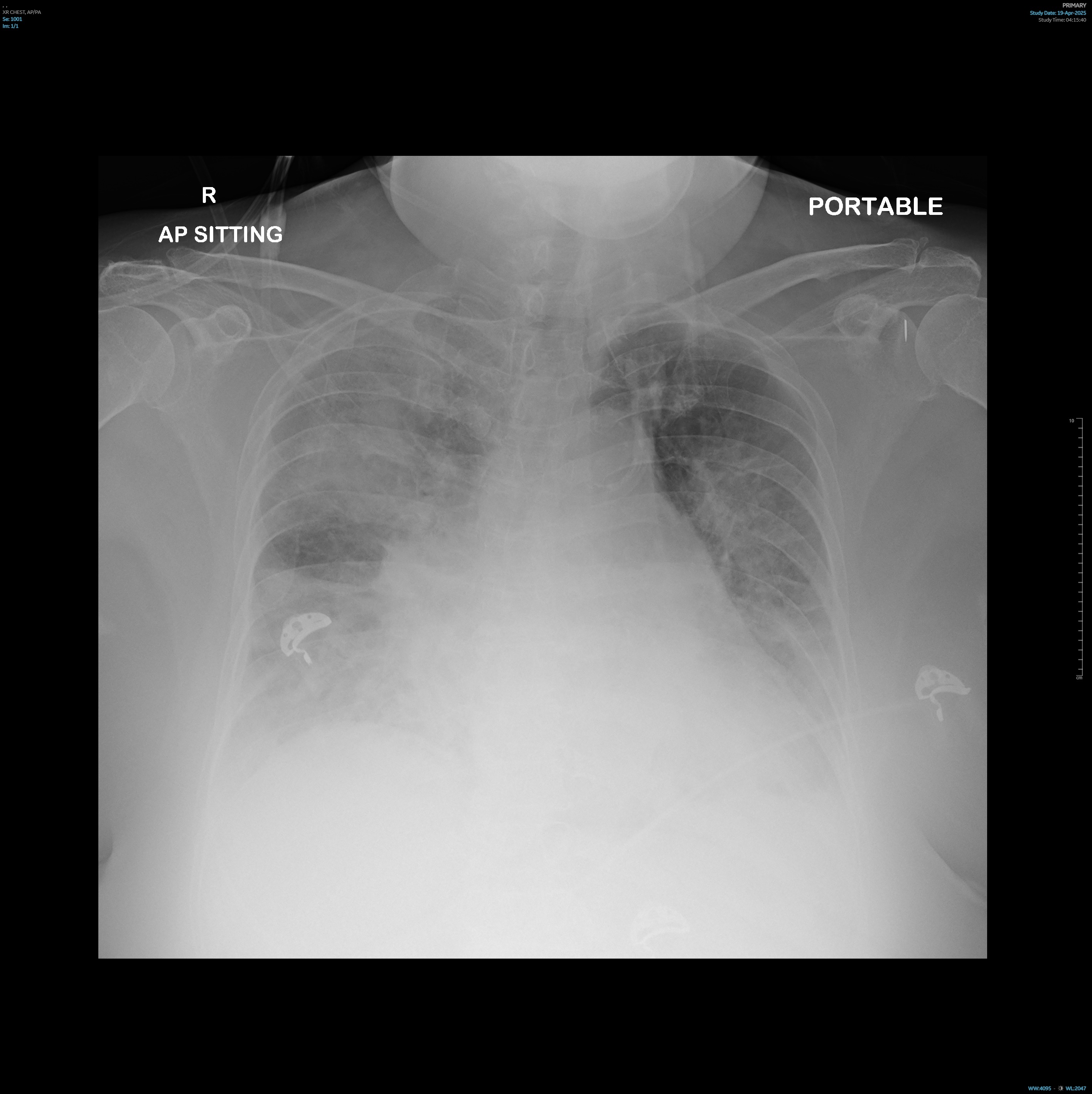 Troponin T continued to uptrend post-intubation and repeat12-lead electrocardiogram (ECG) showed worsening widespread depressions withAVR elevation. Chest X-Ray post-intubation showed rapidly worsening bilateralinfiltrates compared to admission. Bedside ultrasound showed a severely reducedleft ventricular ejection fraction.