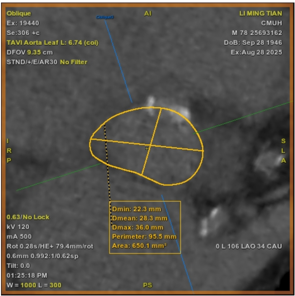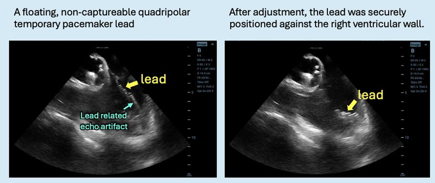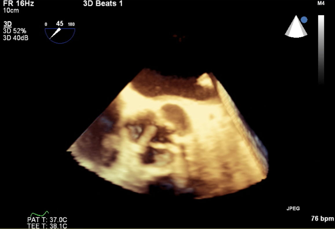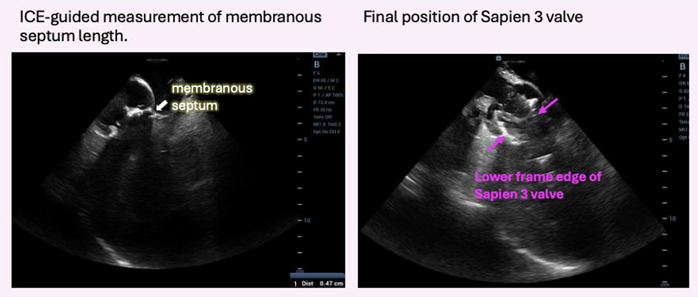 Under general anesthesia, arterial and venous access were obtained via the right femoral artery and vein. A temporary pacing lead was inserted for rapid pacing; however, consistent capture could not be achieved under fluoroscopic guidance. Therefore, intracardiac echocardiography (ICE) was advanced into the right heart to allow precise, close-range localization of the pacing lead. ICE was continuously used to provide real-time monitoring of valve positioning, implantation depth, and the spatial relationship between the transcatheter valve and the membranous septum. A 26-mm Sapien 3 valve was successfully deployed under temporary pacing. Post-deployment angiography and ICE confirmed optimal valve position without conduction disturbance, paravalvular leak, or other complications. The mean aortic valve pressure gradient decreased from 35.5 to 11.2 mmHg. The patient recovered uneventfully after the procedure.