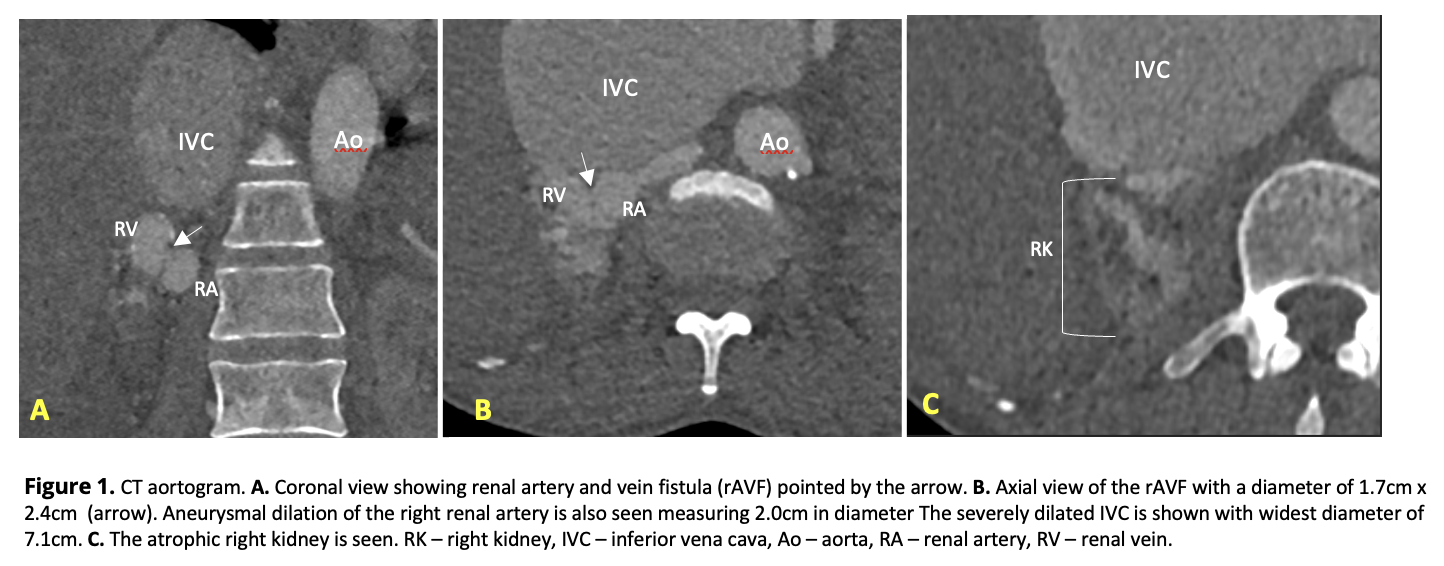 CT aortogram showed an atrophic right kidney with aneurysmal dilation of the distal right renal artery and vein with a fistulous communication in between (1.7x2.4cm, WxAP). The inferior vena cava was severely dilated at 7.1cm. Renal scintigram showed poor right kidney function (6%) and compensatory enlargement of the left (94% function). Echocardiogram showed global hypokinesia, ejection fraction (EF) of 21% with marked dilatation of all chambers and severe pulmonary hypertension (sPAP 48mmHg).