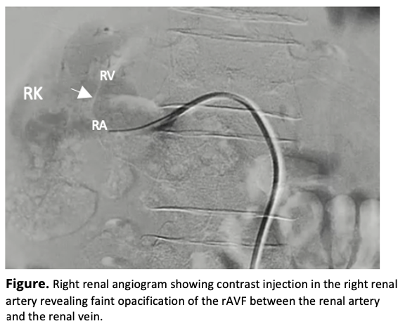 Right renal angiogram revealed a renal artery with an aneurysmal dilatation at its distal segment with a faint opacification of a single fistulous connection to the renal vein, confirming the rAVF seen in the CT aortogram. The fistula measures approximately 3cm in length and 1.7cm in diameter consistent with the CT findings. Based on epidemiology (more commonly acquired than congenital), morphology (single communication, aneurysmal), and chronology of events, the rAVF is considered acquired.